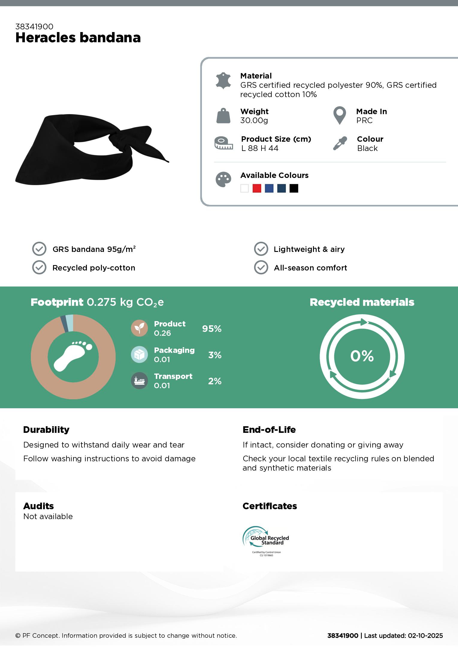 Le bandana Héraclès est composé de 90 % de polyester recyclé GRS et de 10 % de coton recyclé. Léger et respirant (95 g/m²), il peut être porté toute l'année. 90% Polyester recyclé certifié GRS et 10% Coton recyclé certifié GRS.