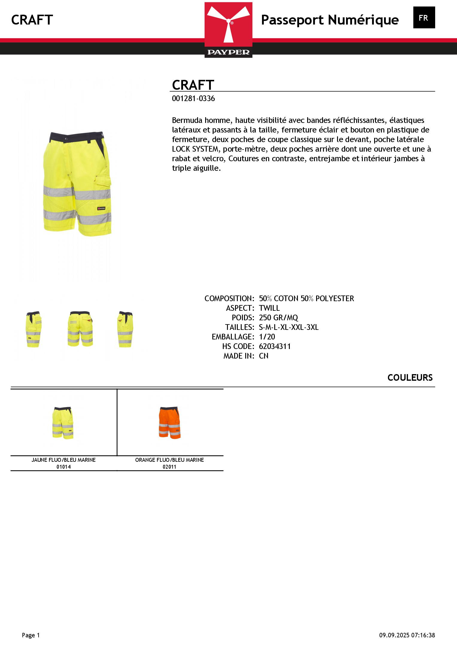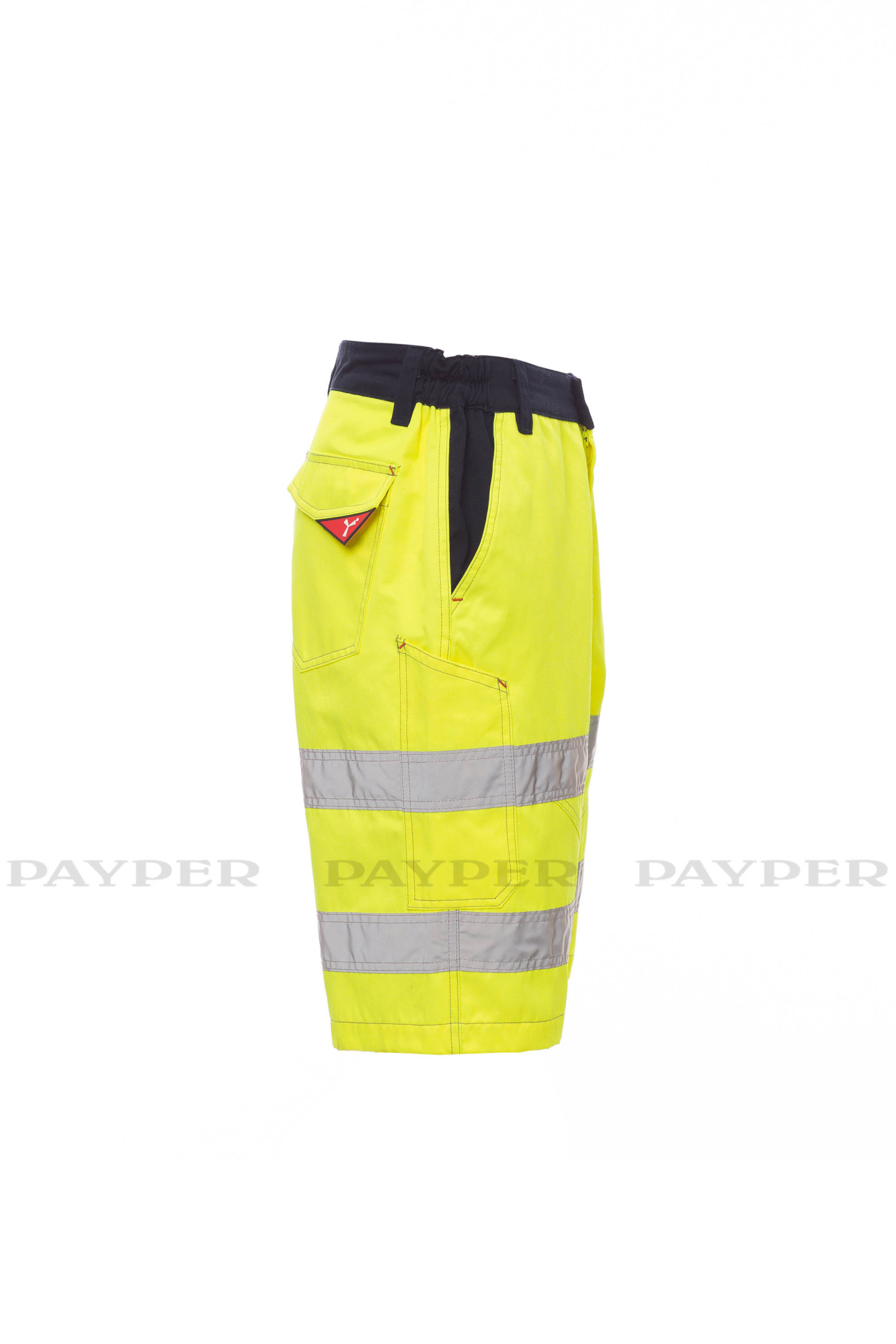 Bermuda homme, haute visibilité avec bandes réfléchissantes, élastiques latéraux et passants à la taille, fermeture éclair et bouton en plastique de fermeture, deux poches de coupe classique sur le devant, poche latérale LOCK SYSTEM, porte-mètre, deux poches arrière dont une ouverte et une à rabat et velcro, Coutures en contraste, entrejambe et intérieur jambes à triple aiguille.