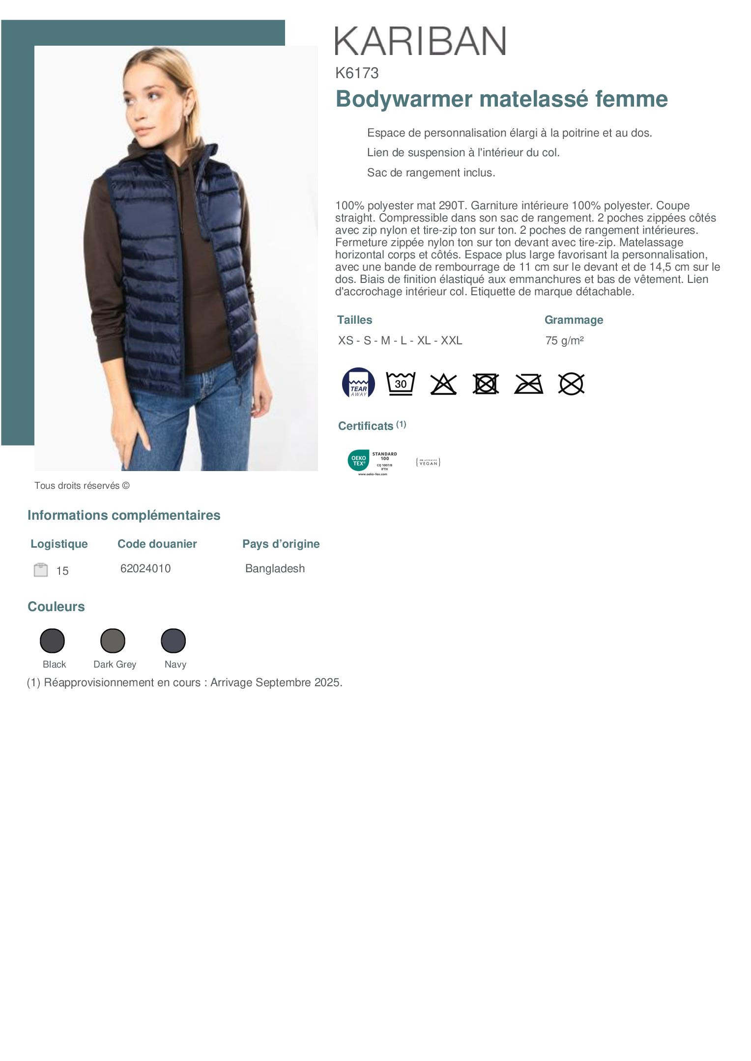 100% polyester mat 290T. Garniture intérieure 100% polyester. Coupe straight. Compressible dans son sac de rangement. 2 poches zippées côtés avec zip nylon et tire-zip ton sur ton. 2 poches de rangement intérieures. Fermeture zippée nylon ton sur ton devant avec tire-zip. Matelassage horizontal corps et côtés. Espace plus large favorisant la personnalisation, avec une bande de rembourrage de 11 cm sur le devant et de 14,5 cm sur le dos. Biais de finition élastiqué aux emmanchures et bas de vêtement. Lien d'accrochage intérieur col. Etiquette de marque détachable.