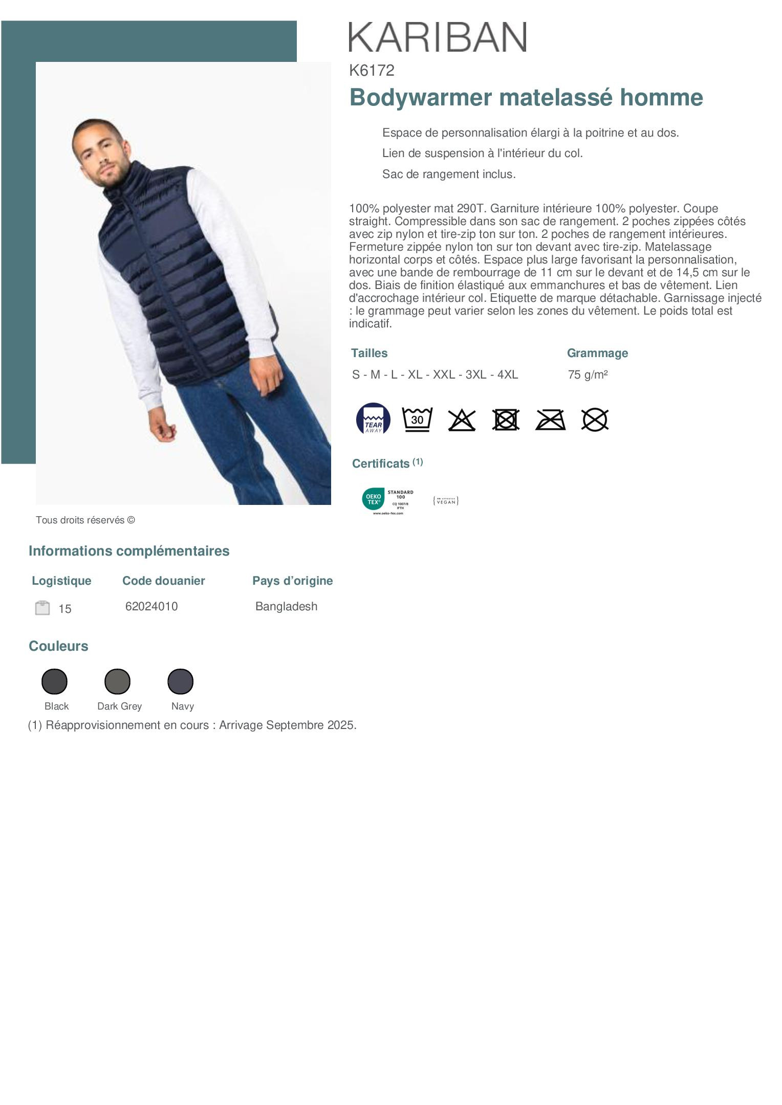 100% polyester mat 290T. Garniture intérieure 100% polyester. Coupe straight. Compressible dans son sac de rangement. 2 poches zippées côtés avec zip nylon et tire-zip ton sur ton. 2 poches de rangement intérieures. Fermeture zippée nylon ton sur ton devant avec tire-zip. Matelassage horizontal corps et côtés. Espace plus large favorisant la personnalisation, avec une bande de rembourrage de 11 cm sur le devant et de 14,5 cm sur le dos. Biais de finition élastiqué aux emmanchures et bas de vêtement. Lien d'accrochage intérieur col. Etiquette de marque détachable. Garnissage injecté : le grammage peut varier selon les zones du vêtement. Le poids total est indicatif.