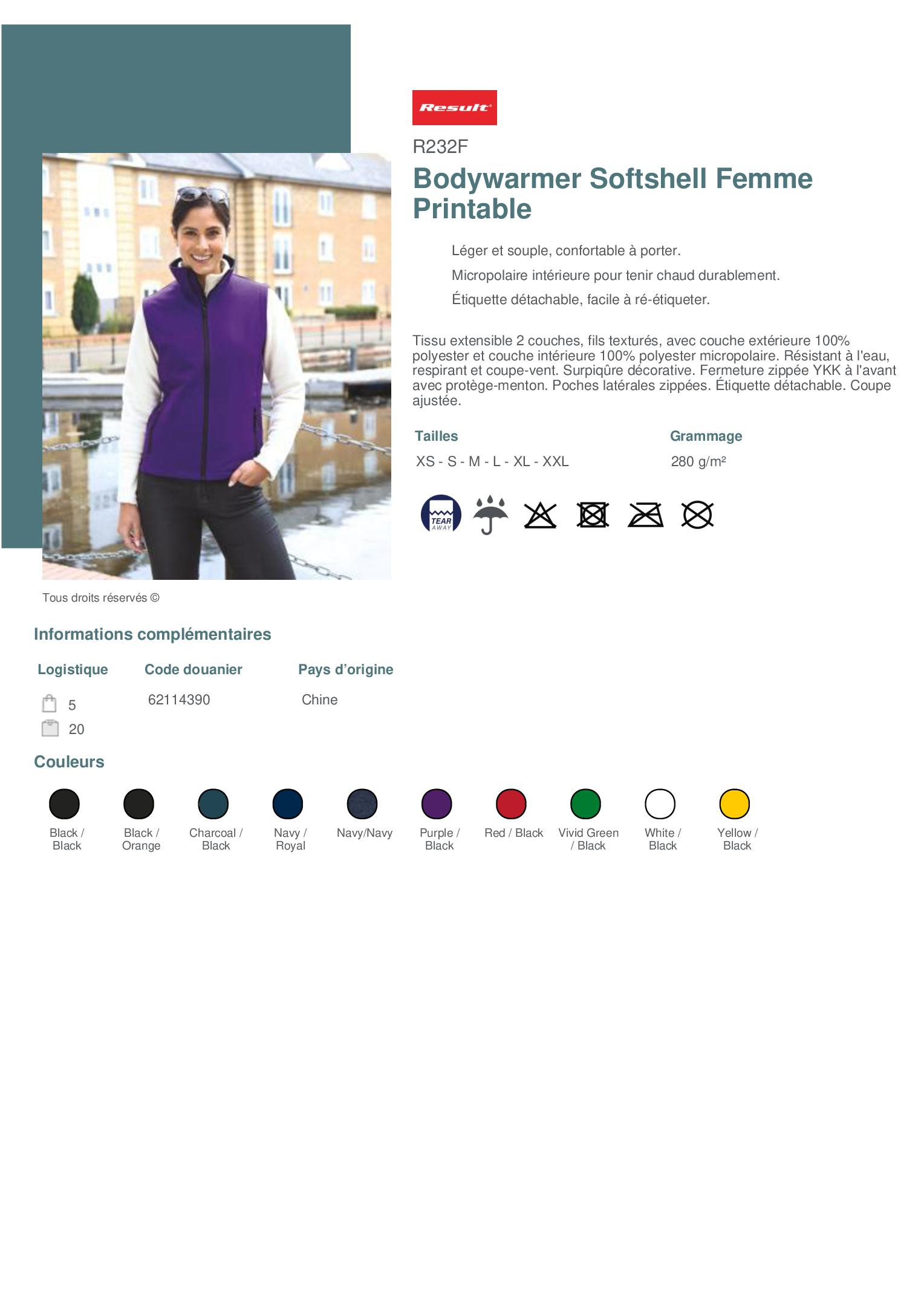 Conçue pour offrir un confort optimal tout en maintenant la chaleur, cette veste sans manches softshell est dotée d’un intérieur en micropolaire douce qui assure une isolation thermique durable sans ajouter de poids inutile. Sa coupe ergonomique et son tissu souple garantissent une grande liberté de mouvement. Parfaite pour la mi-saison ou comme couche intermédiaire, cette softshell est également équipée d’une étiquette détachable, idéale pour le marquage ou la personnalisation textile.