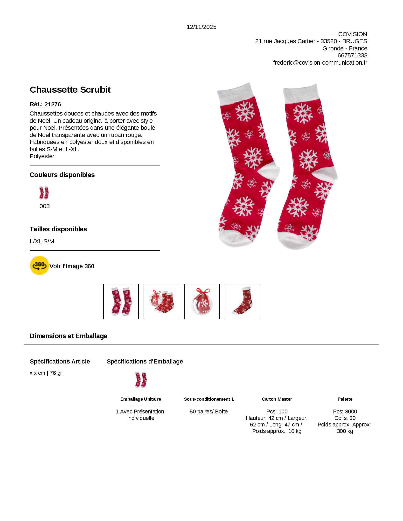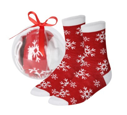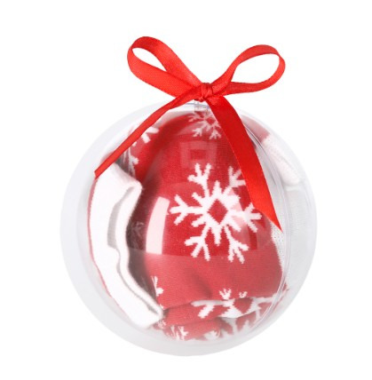 Chaussettes douces et chaudes avec des motifs de Noël. Un cadeau original à porter avec style pour Noël. Présentées dans une élégante boule de Noël transparente avec un ruban rouge. Fabriquées en polyester doux et disponibles en tailles S-M et L-XL. Polyester
