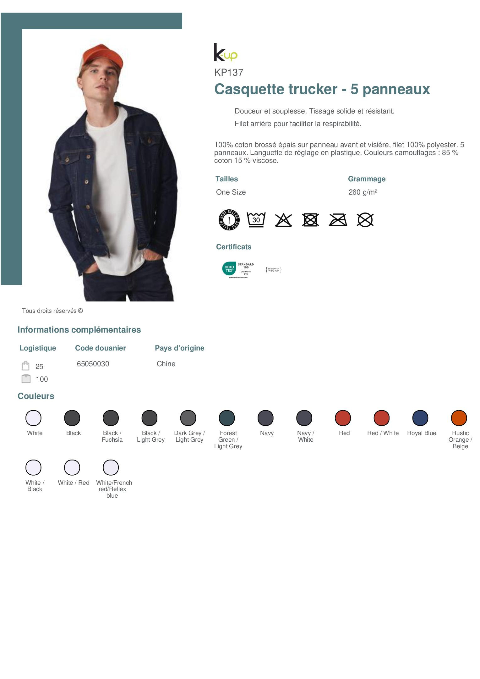 100% coton brossé épais sur panneau avant et visière, filet 100% polyester. 5 panneaux. Languette de réglage en plastique. Couleurs camouflages : 85 % coton 15 % viscose.