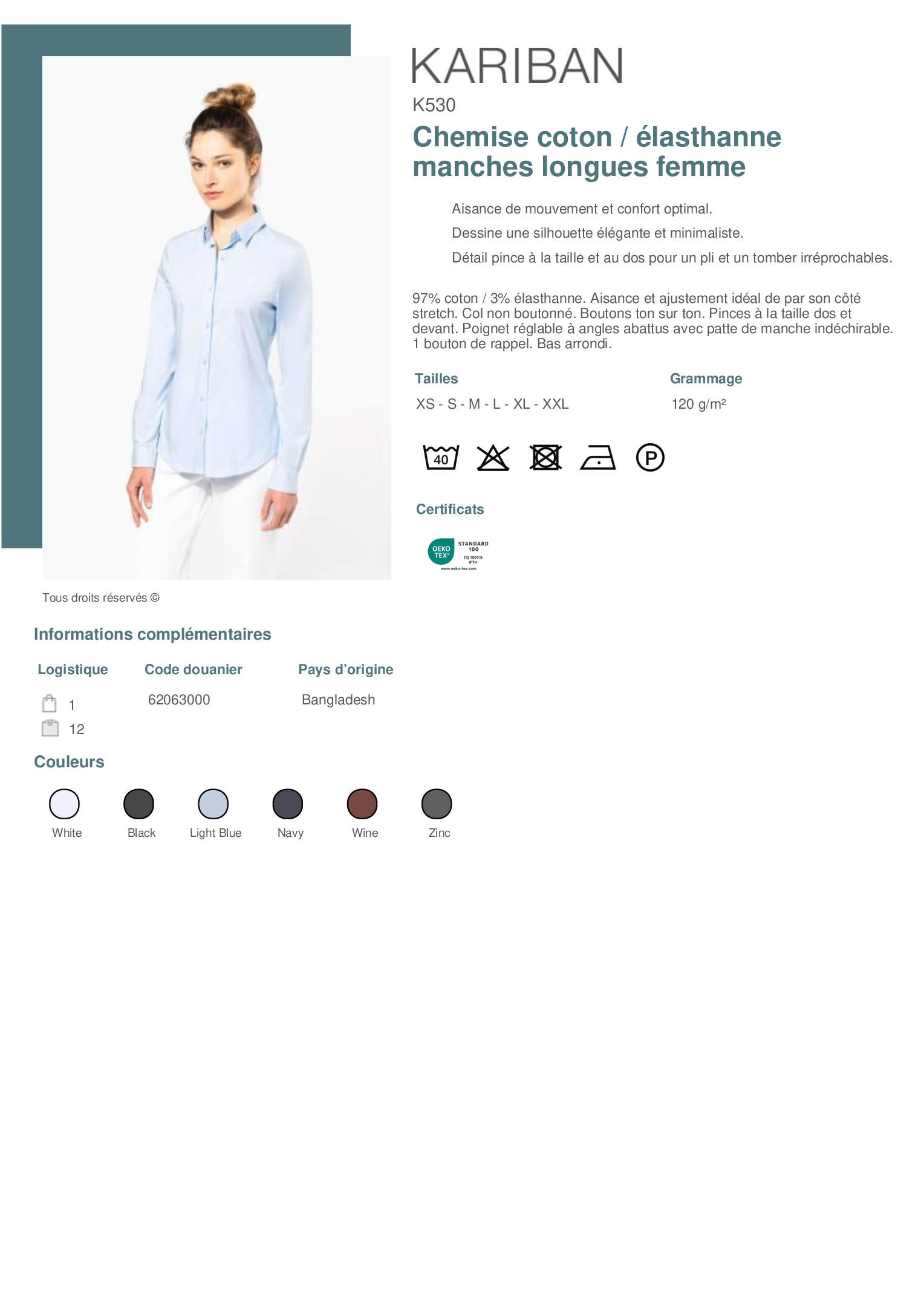 97% coton / 3% élasthanne. Aisance et ajustement idéal de par son côté stretch. Col non boutonné. Boutons ton sur ton. Pinces à la taille dos et devant. Poignet réglable à angles abattus avec patte de manche indéchirable. 1 bouton de rappel. Bas arrondi.