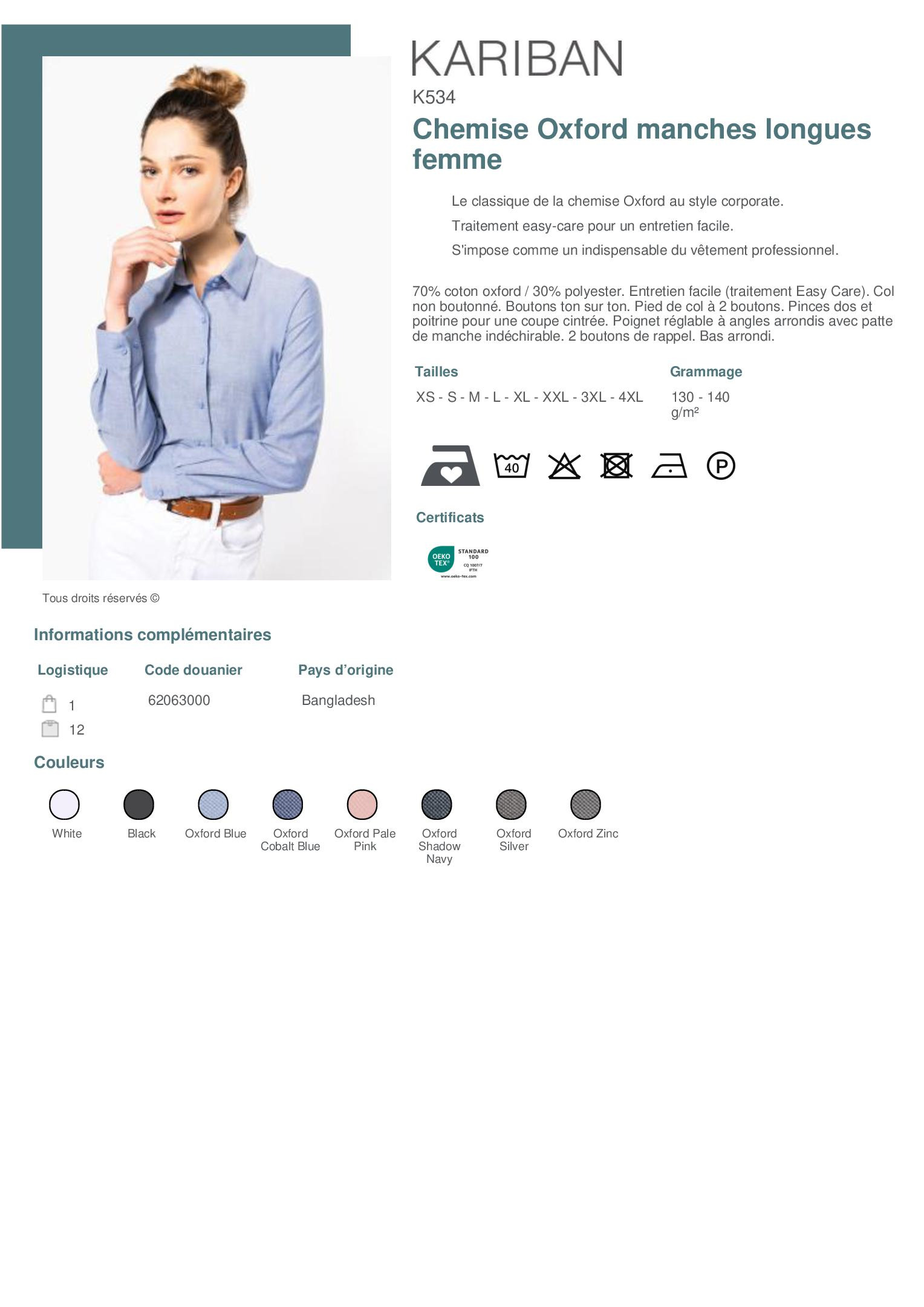 70% coton oxford / 30% polyester. Entretien facile (traitement Easy Care). Col non boutonné. Boutons ton sur ton. Pied de col à 2 boutons. Pinces dos et poitrine pour une coupe cintrée. Poignet réglable à angles arrondis avec patte de manche indéchirable. 2 boutons de rappel. Bas arrondi.