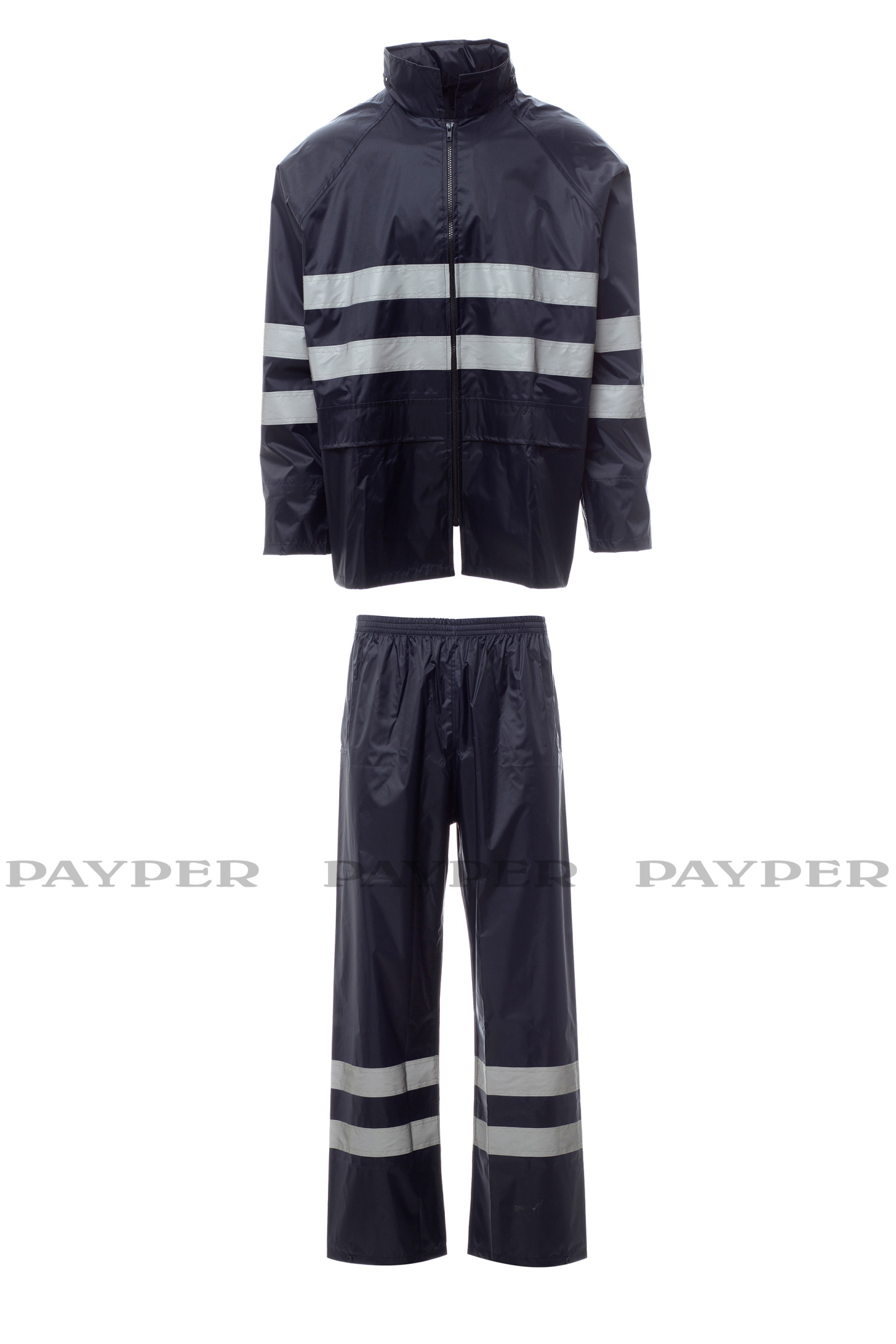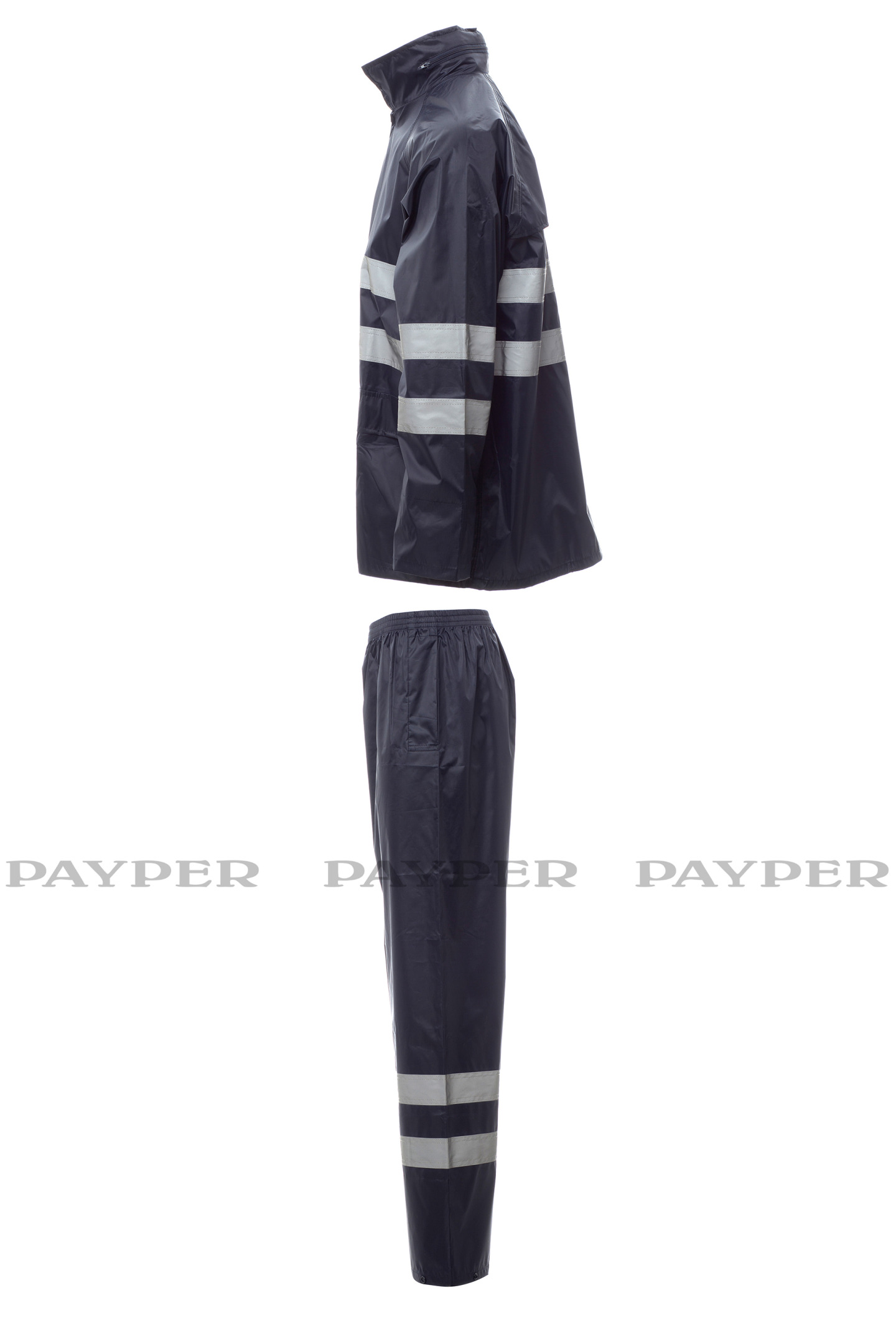 Ensemble anti-pluie, avec enduit en PVC, composé de : veste avec zip, capuche pliable dans le col, bas des manches droit, avec élastique aux poignets, tramage dos. Pantalon avec élastique à la taille et deux poches ouvertes. Bande rétroréfléchissantes sur les bras, le devant et le dos de la veste ainsi que sur les parties inférieures du pantalon. Sac individuel avec zip.