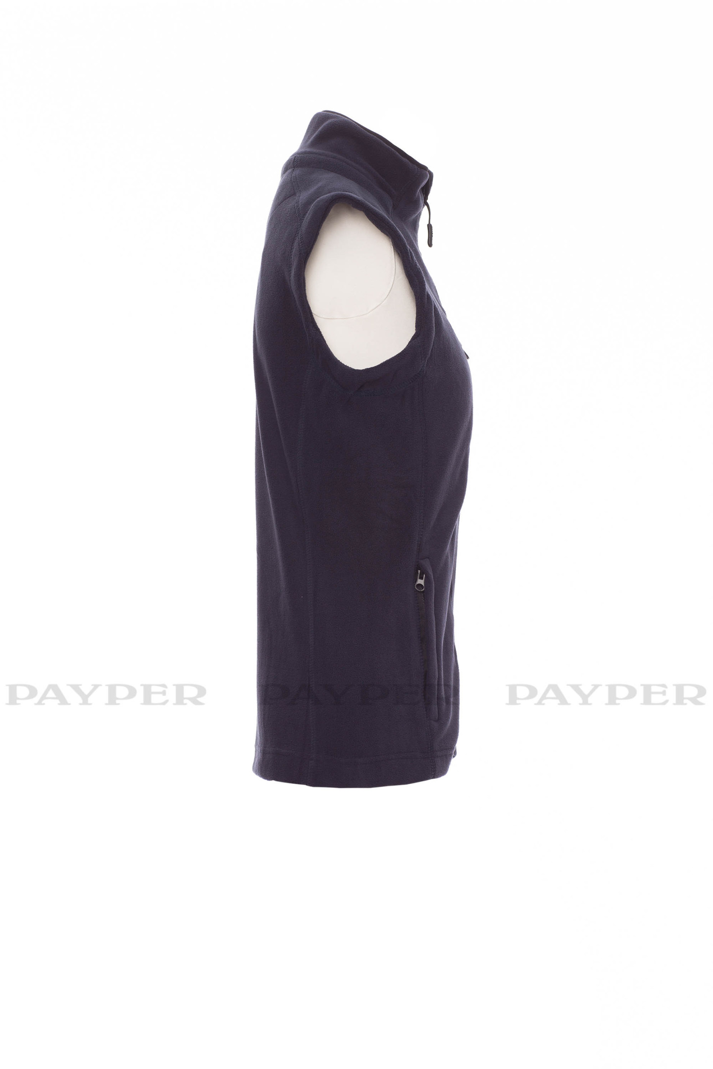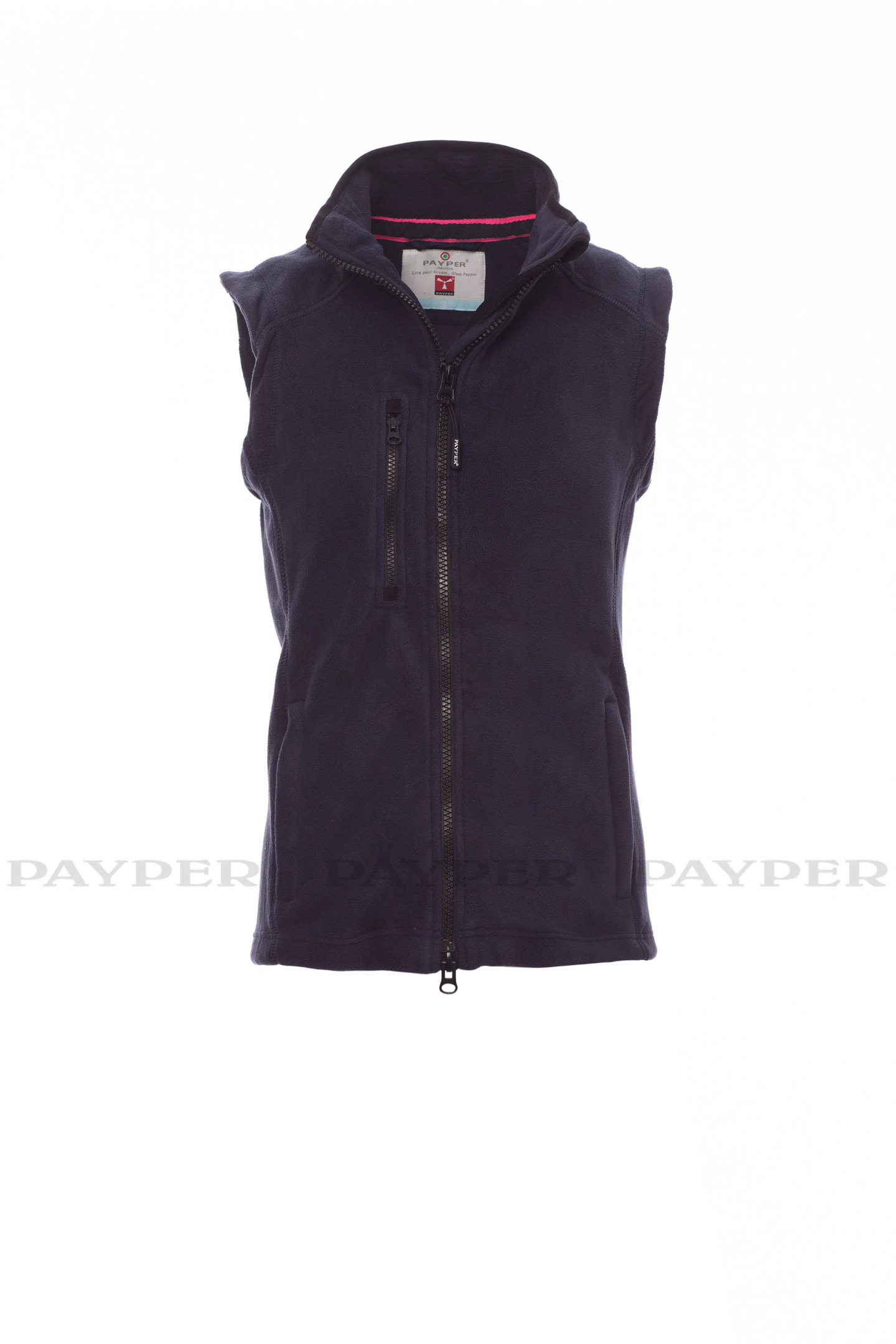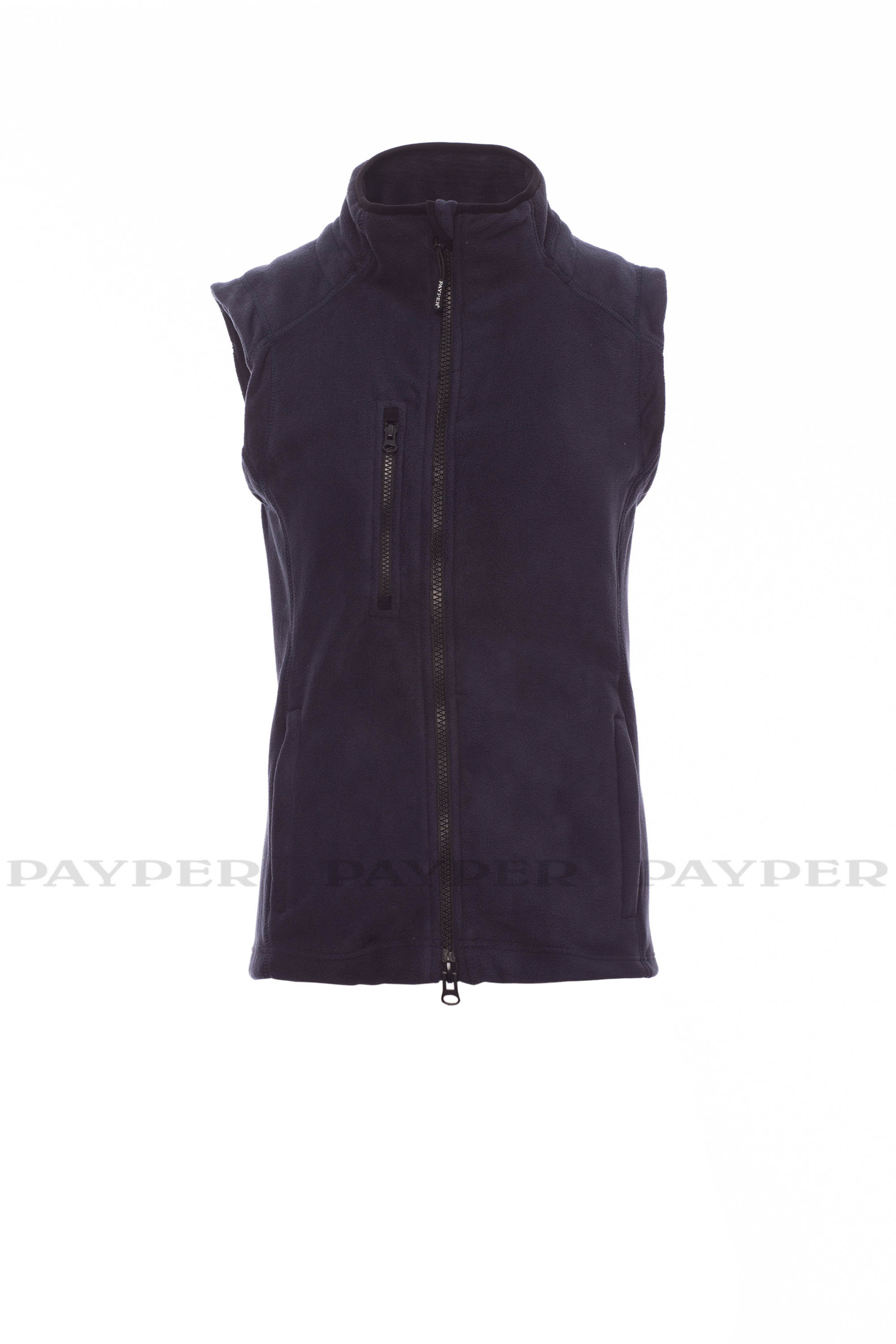 Gilet cintré en polaire pour femme, zip intégral en plastique à double curseur, coupe raglan, deux poches frontales avec zip couvert et une poche poitrine avec zip.