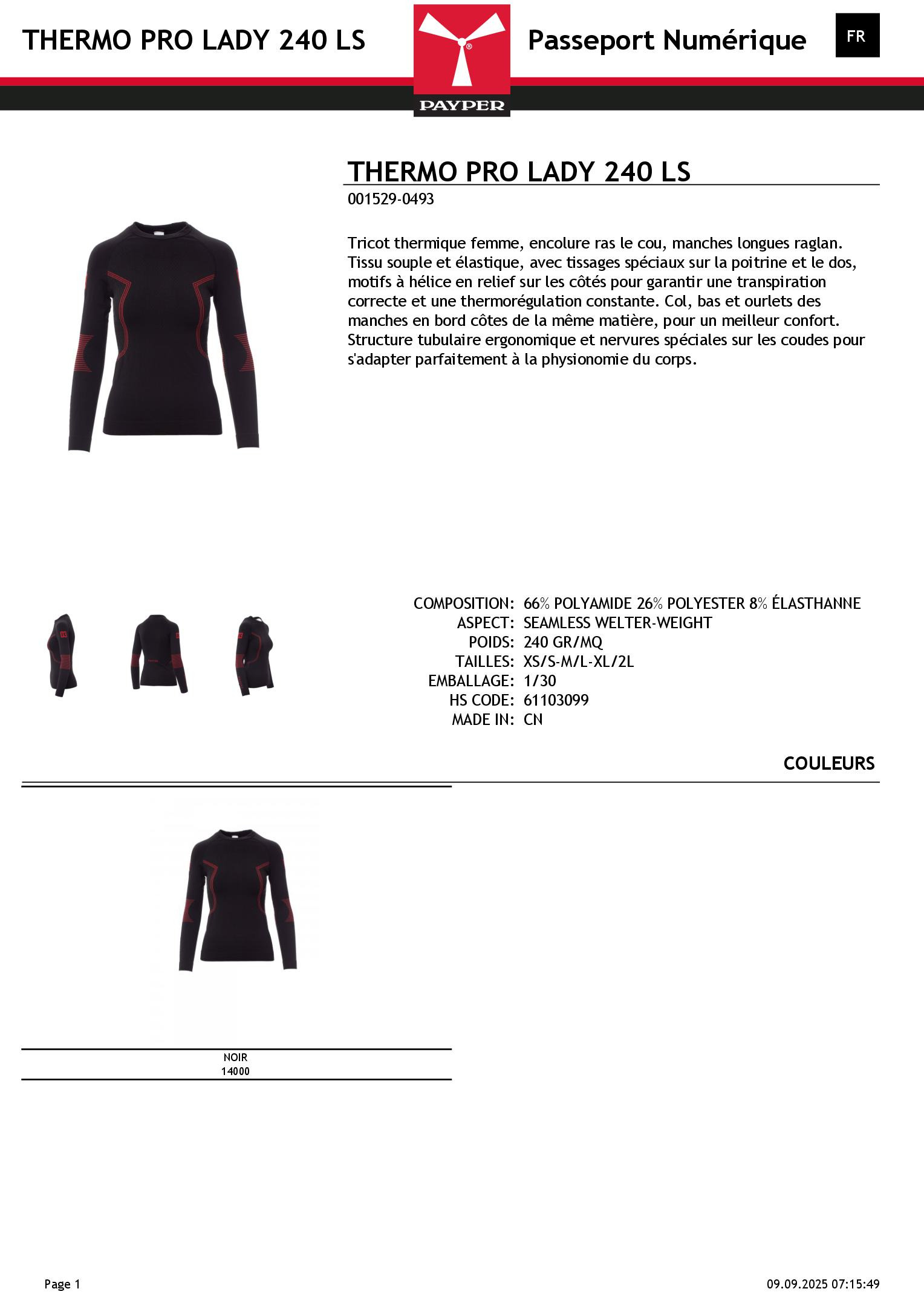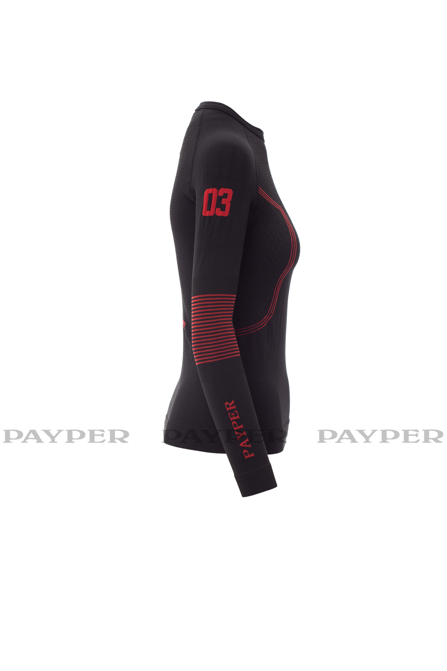 Tricot thermique femme, encolure ras le cou, manches longues raglan. Tissu souple et élastique, avec tissages spéciaux sur la poitrine et le dos, motifs à hélice en relief sur les côtés pour garantir une transpiration correcte et une thermorégulation constante. Col, bas et ourlets des manches en bord côtes de la même matière, pour un meilleur confort. Structure tubulaire ergonomique et nervures spéciales sur les coudes pour s'adapter parfaitement à la physionomie du corps.
