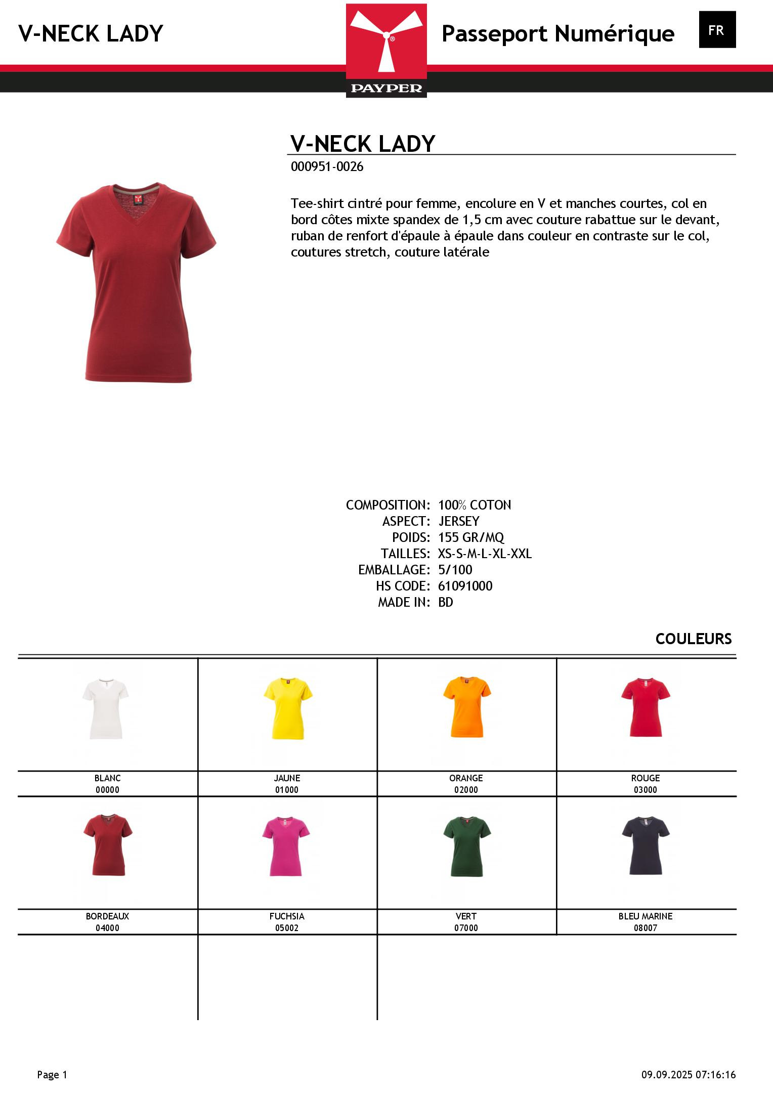 Tee-shirt cintré pour femme, encolure en V et manches courtes, col en bord côtes mixte spandex de 1,5 cm avec couture rabattue sur le devant, ruban de renfort d'épaule à épaule dans couleur en contraste sur le col, coutures stretch, couture latérale