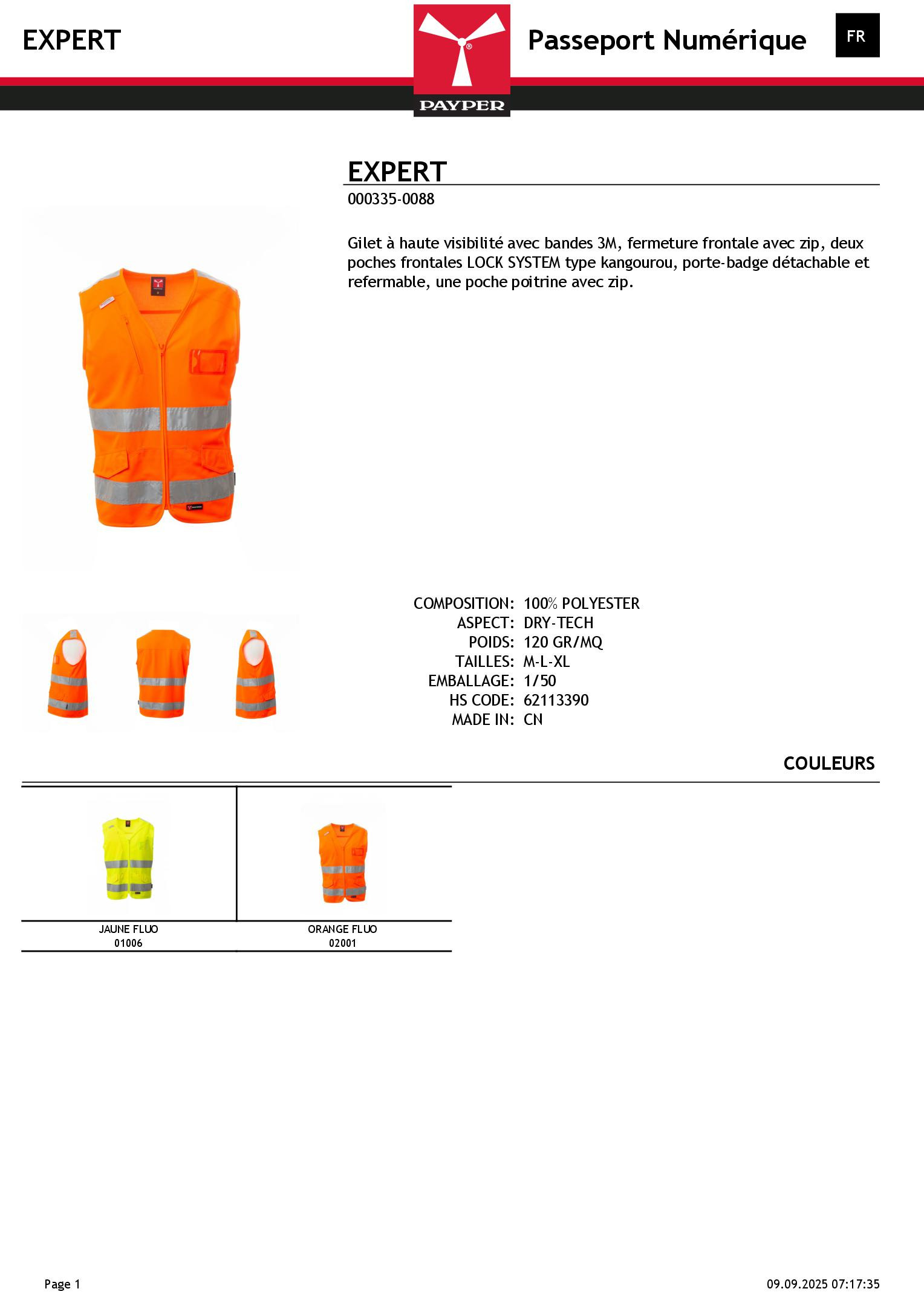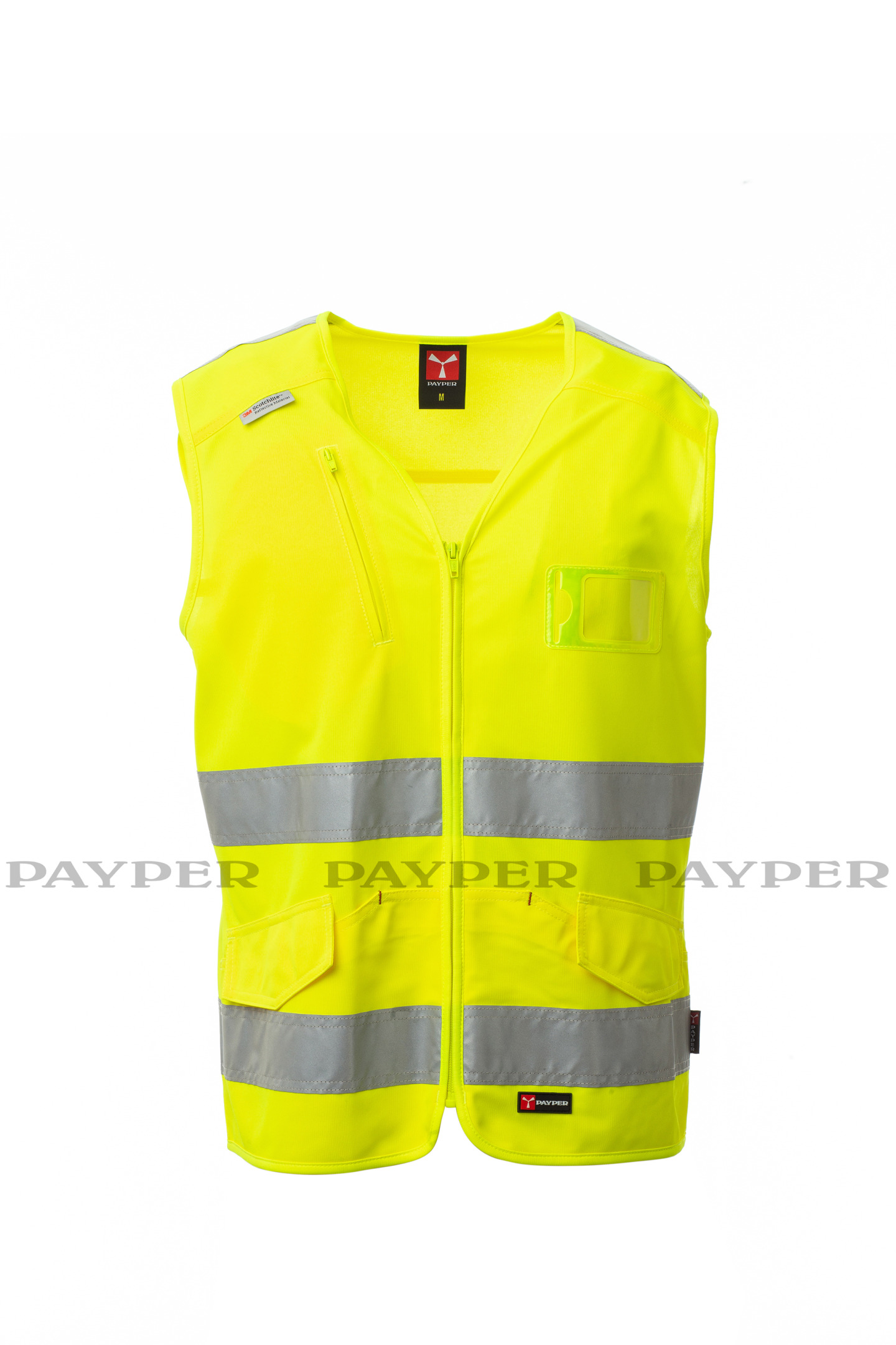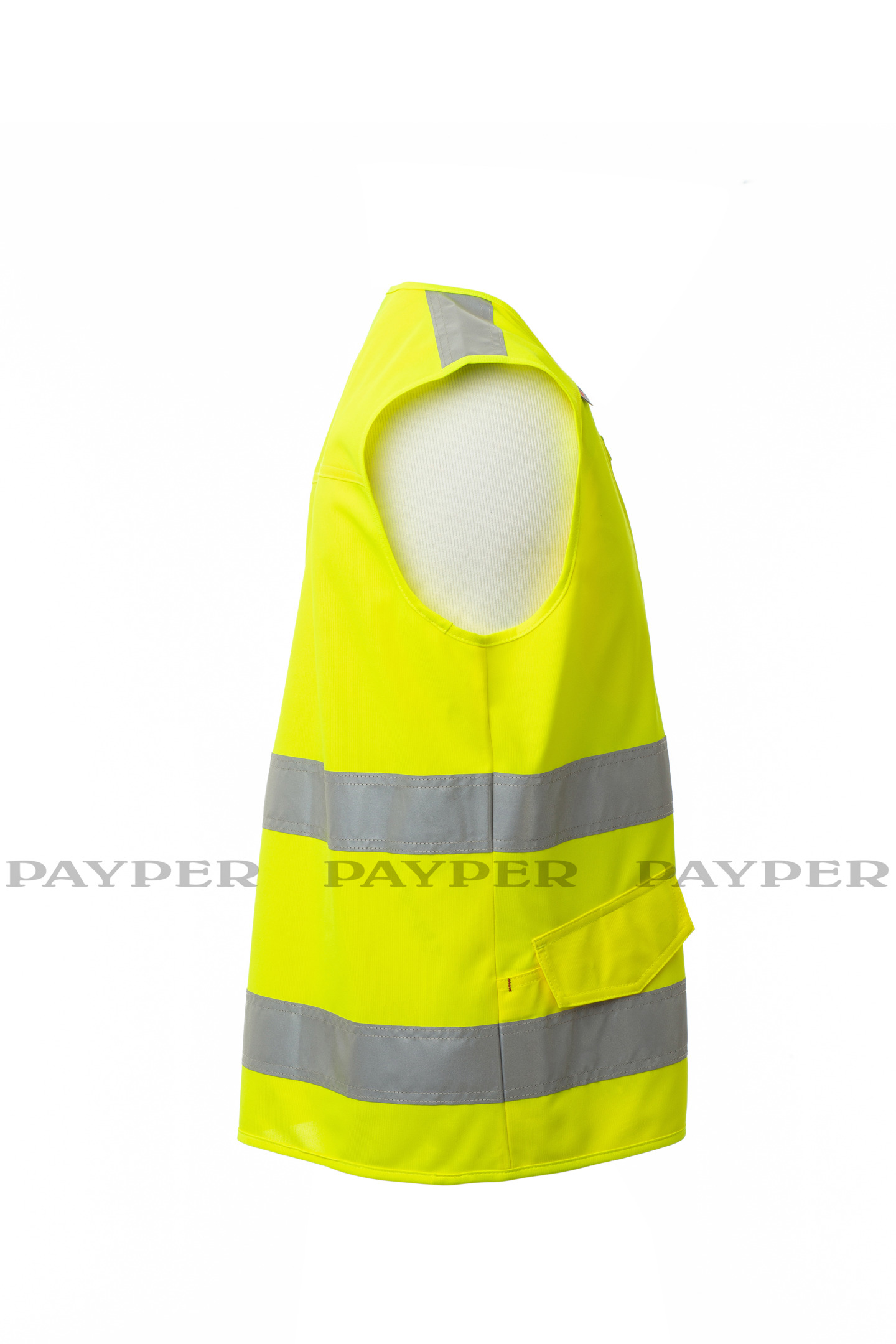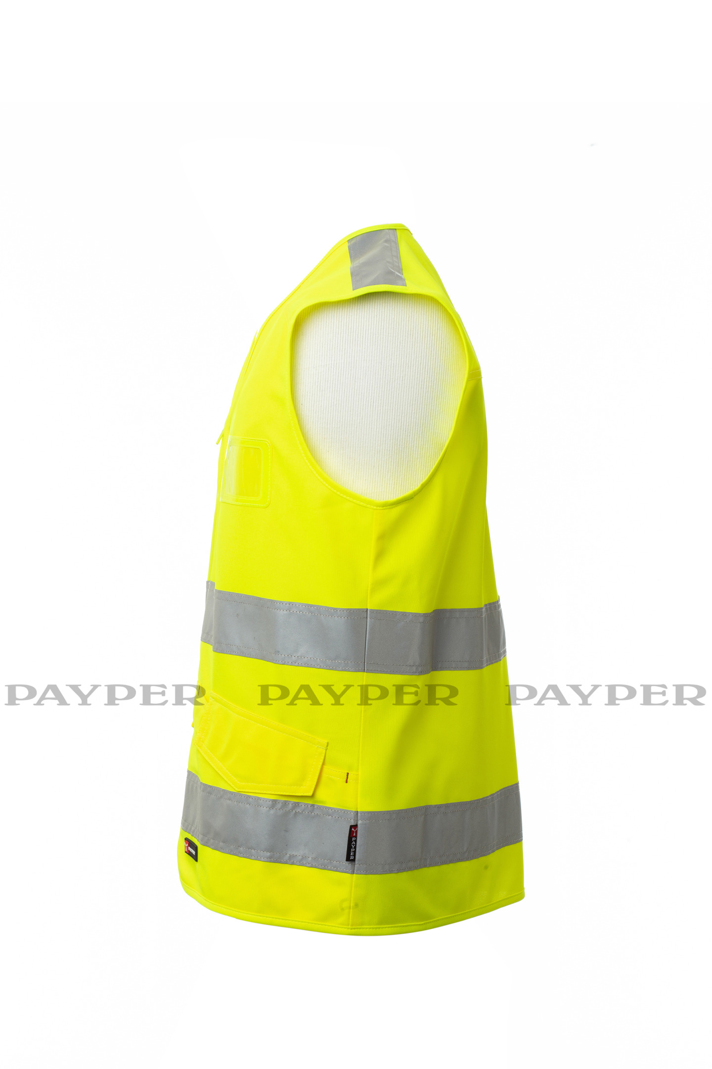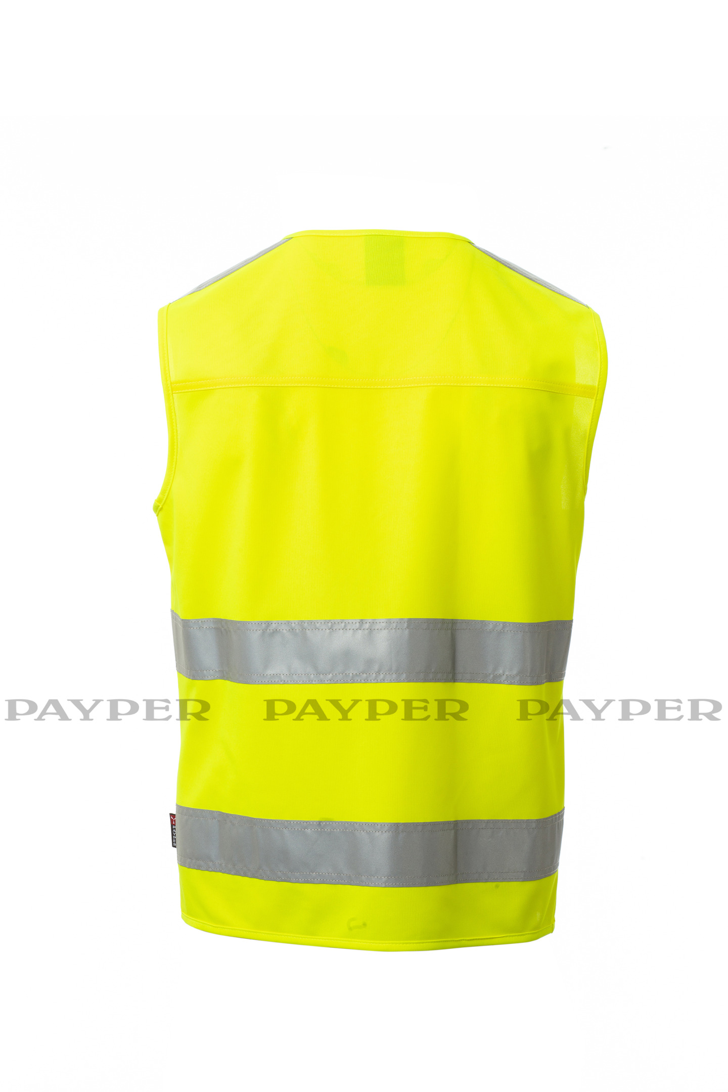 Gilet à haute visibilité avec bandes 3M, fermeture frontale avec zip, deux poches frontales LOCK SYSTEM type kangourou, porte-badge détachable et refermable, une poche poitrine avec zip.