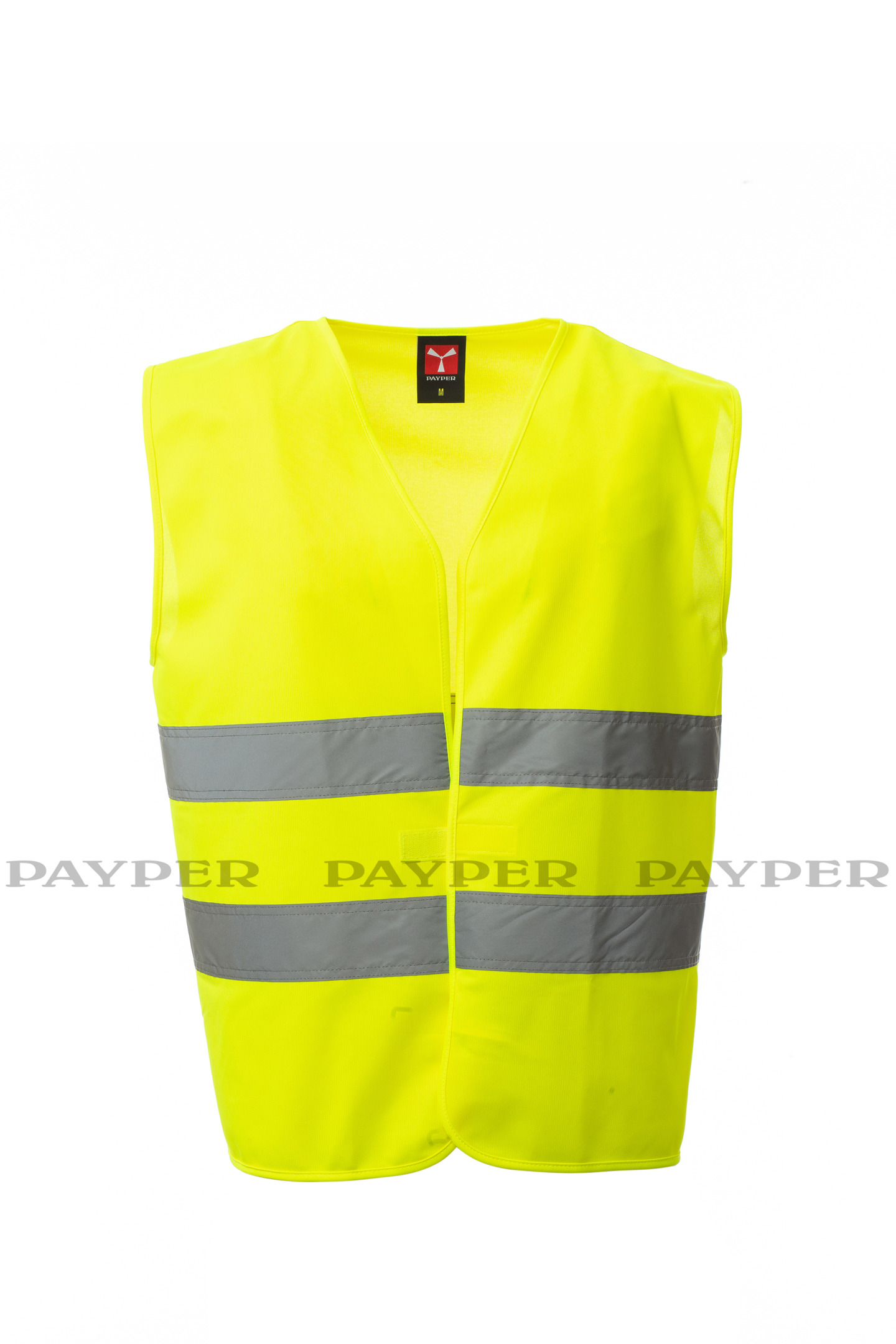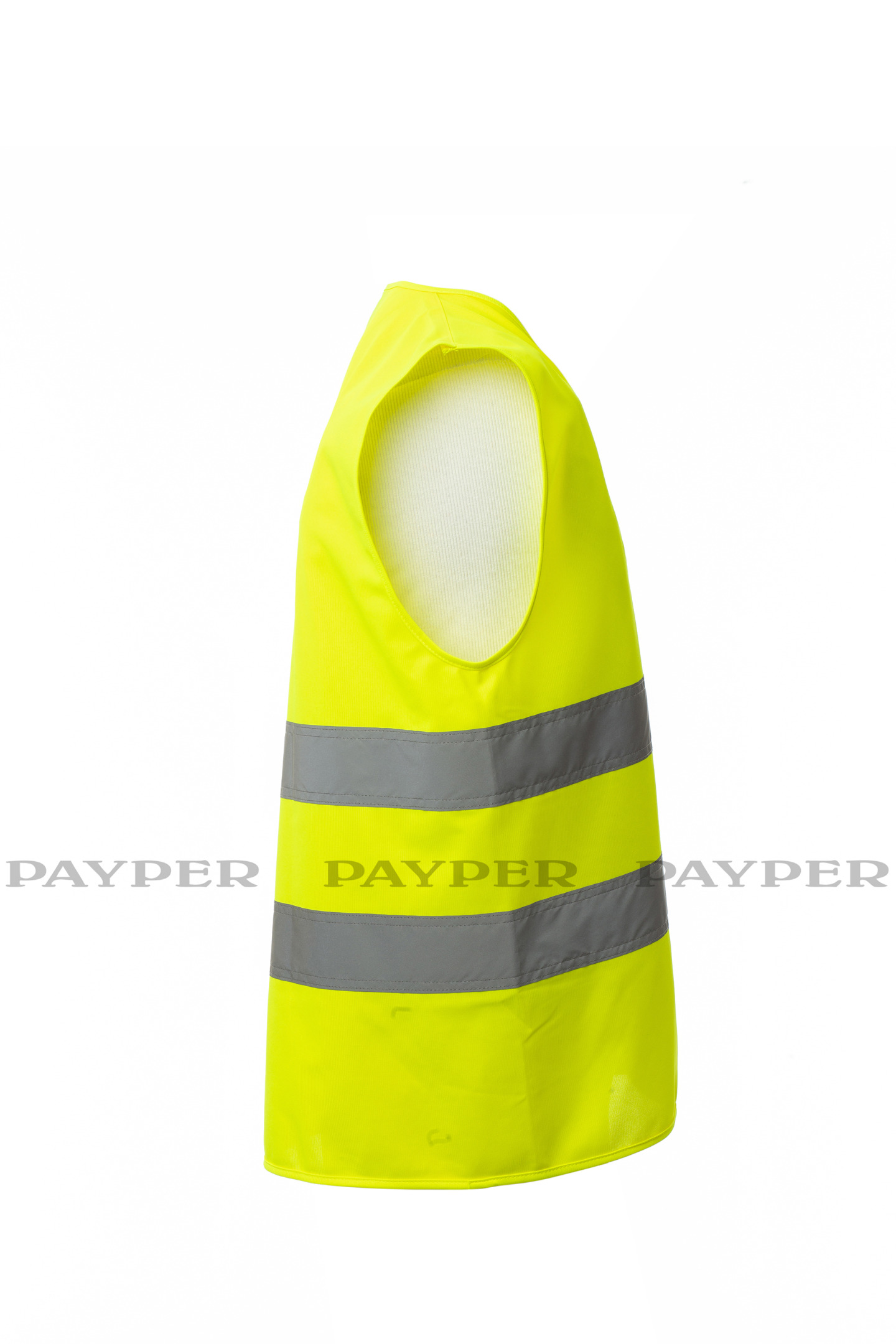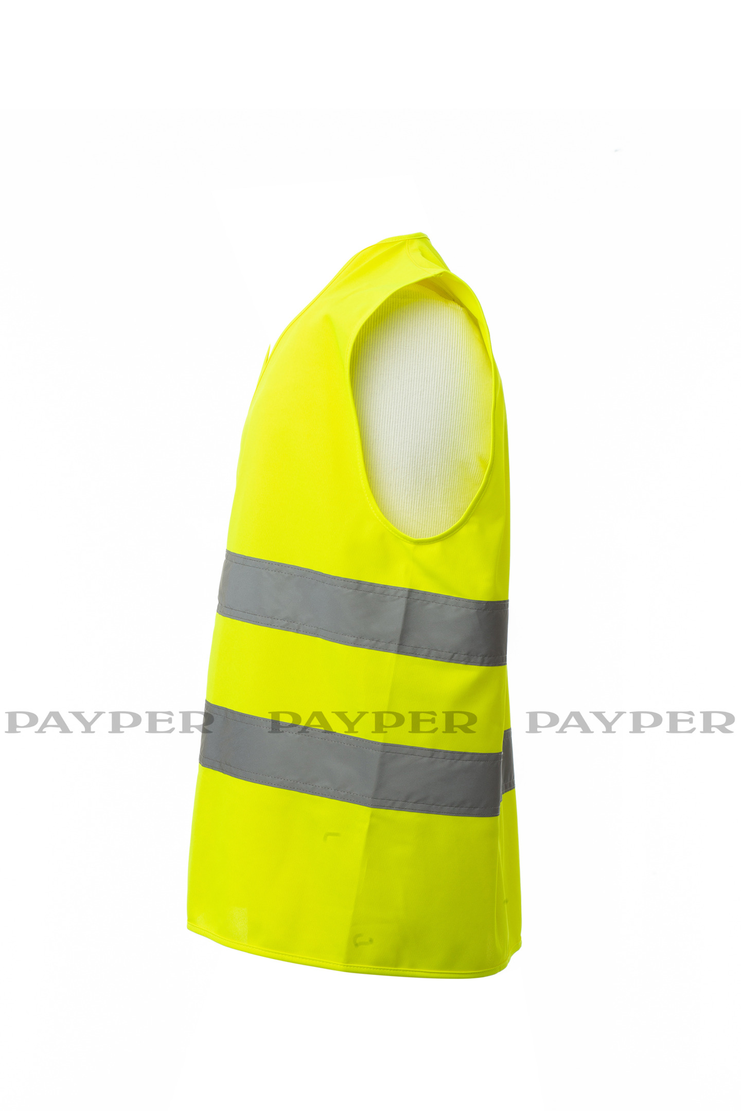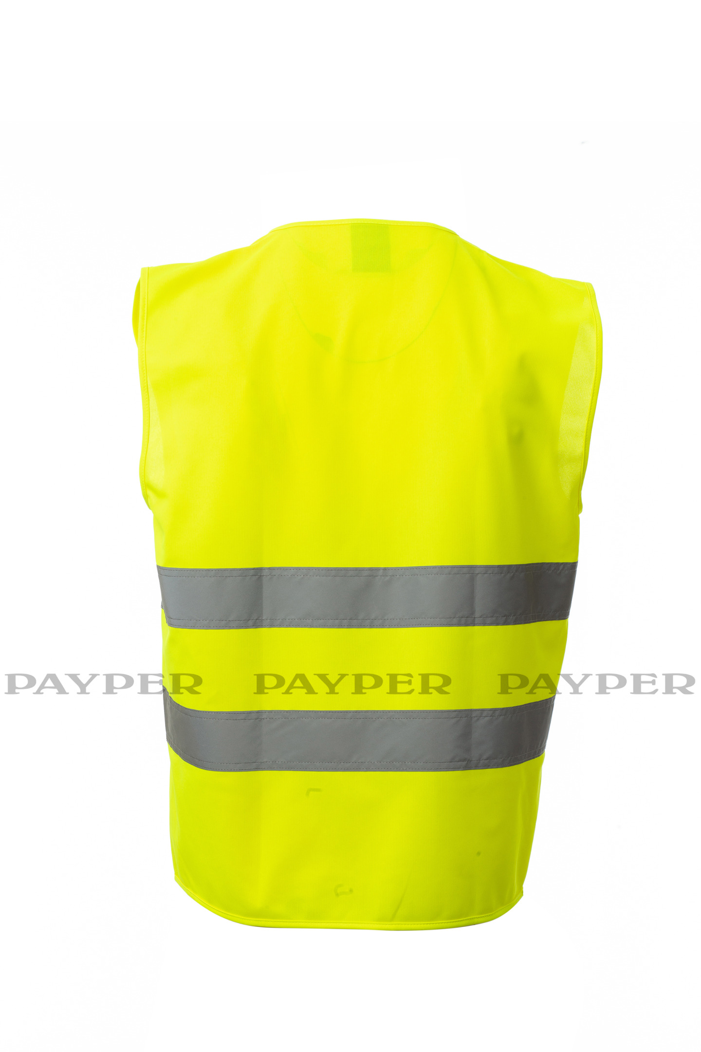 Gilet haute visibilité avec bandes rétroréfléchissantes, coutures à deux aiguilles, fermeture par velcro, entièrement bordé.