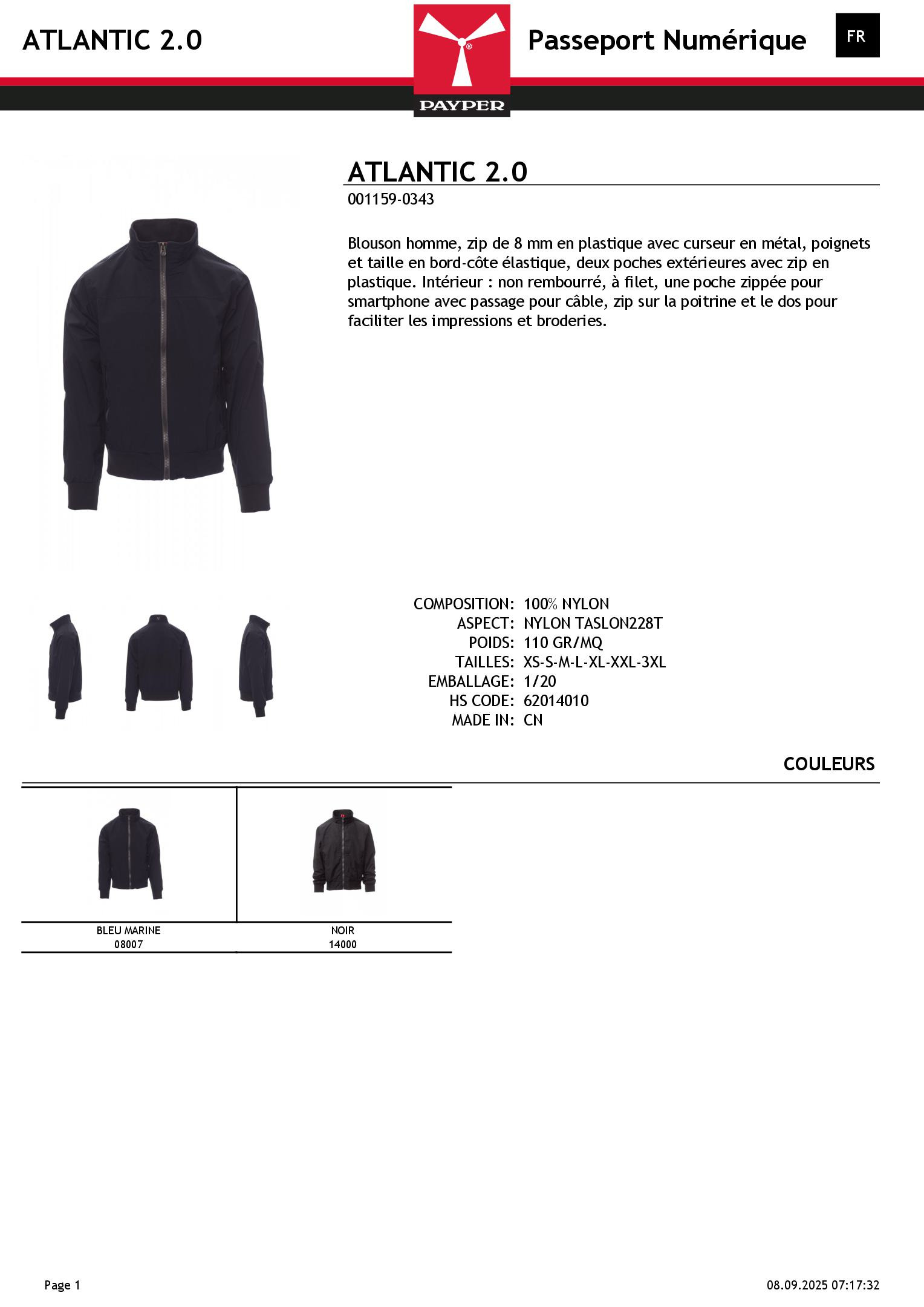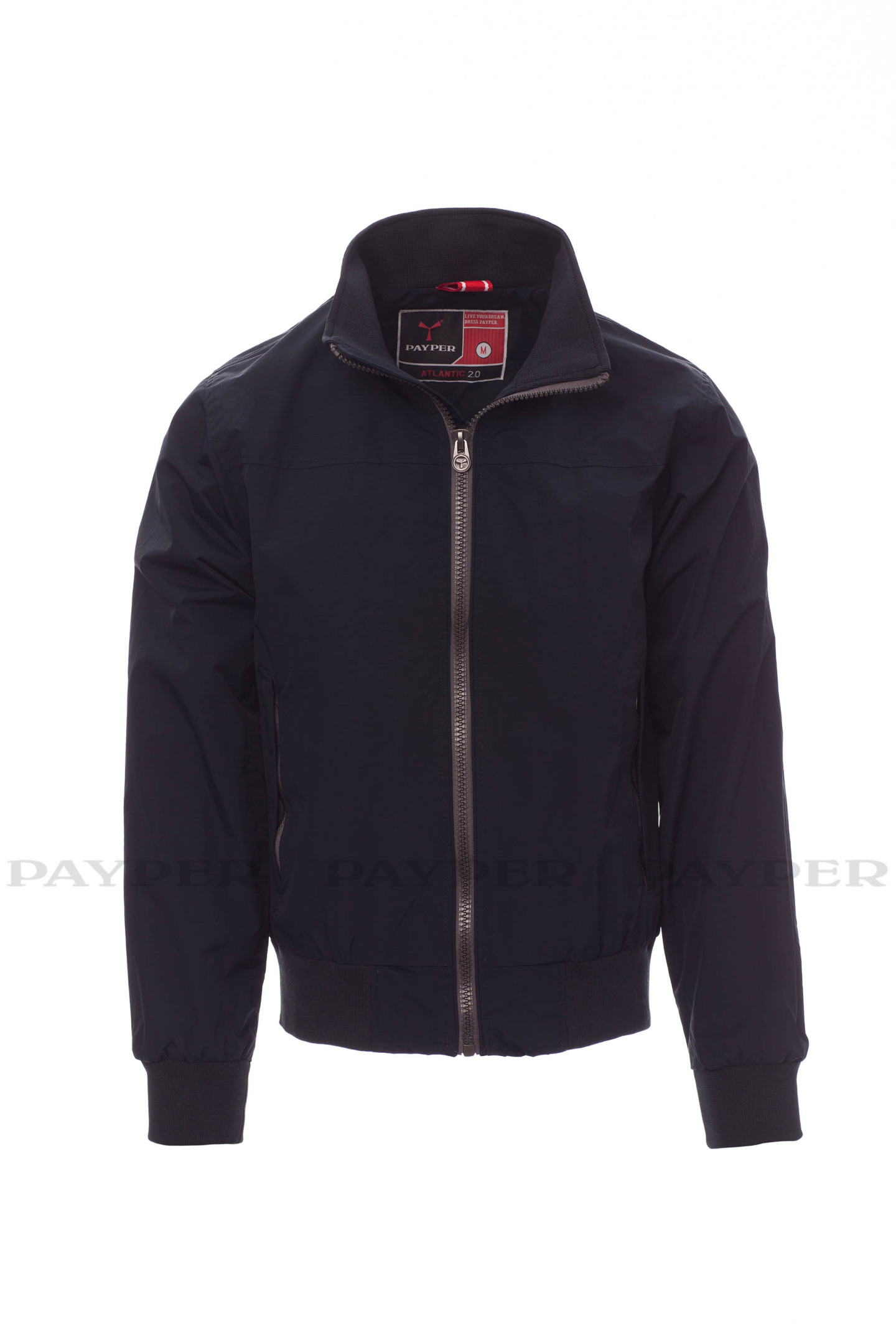 Blouson homme, zip de 8 mm en plastique avec curseur en métal, poignets et taille en bord-côte élastique, deux poches extérieures avec zip en plastique. Intérieur : non rembourré, à filet, une poche zippée pour smartphone avec passage pour câble, zip sur la poitrine et le dos pour faciliter les impressions et broderies.
