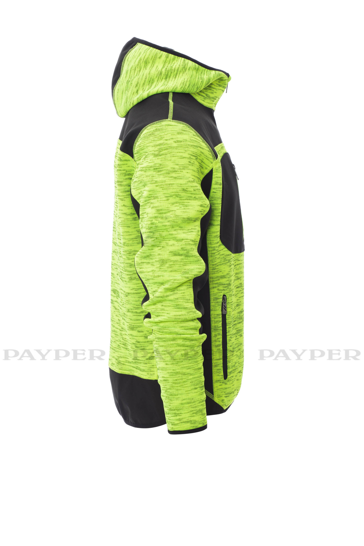 Tricot technique avec inserts en soft-shell noirs, bicolore, zip long SBS avec ruban, capuche profilée avec deux coutures, fin liseré aux poignets et à la taille, deux poches latérales avec zip, une poche poitrine.