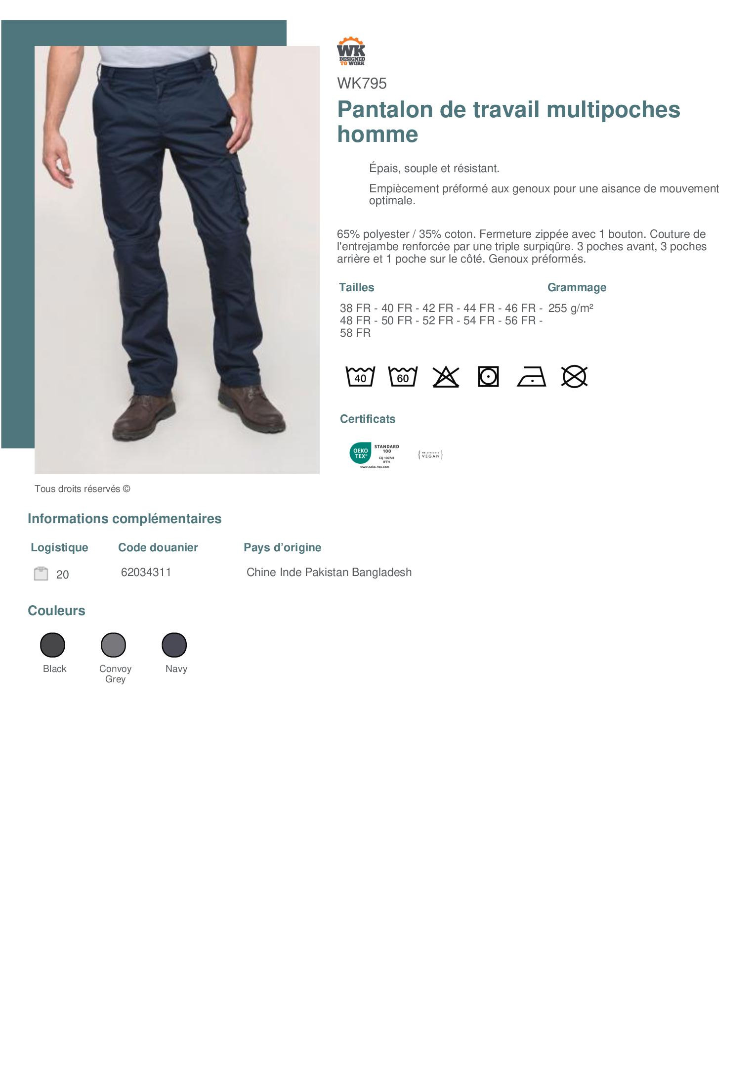 65% polyester / 35% coton. Fermeture zippée avec 1 bouton. Couture de l’entrejambe renforcée par une triple surpiqûre. 3 poches avant, 3 poches arrière et 1 poche sur le côté. Genoux préformés.