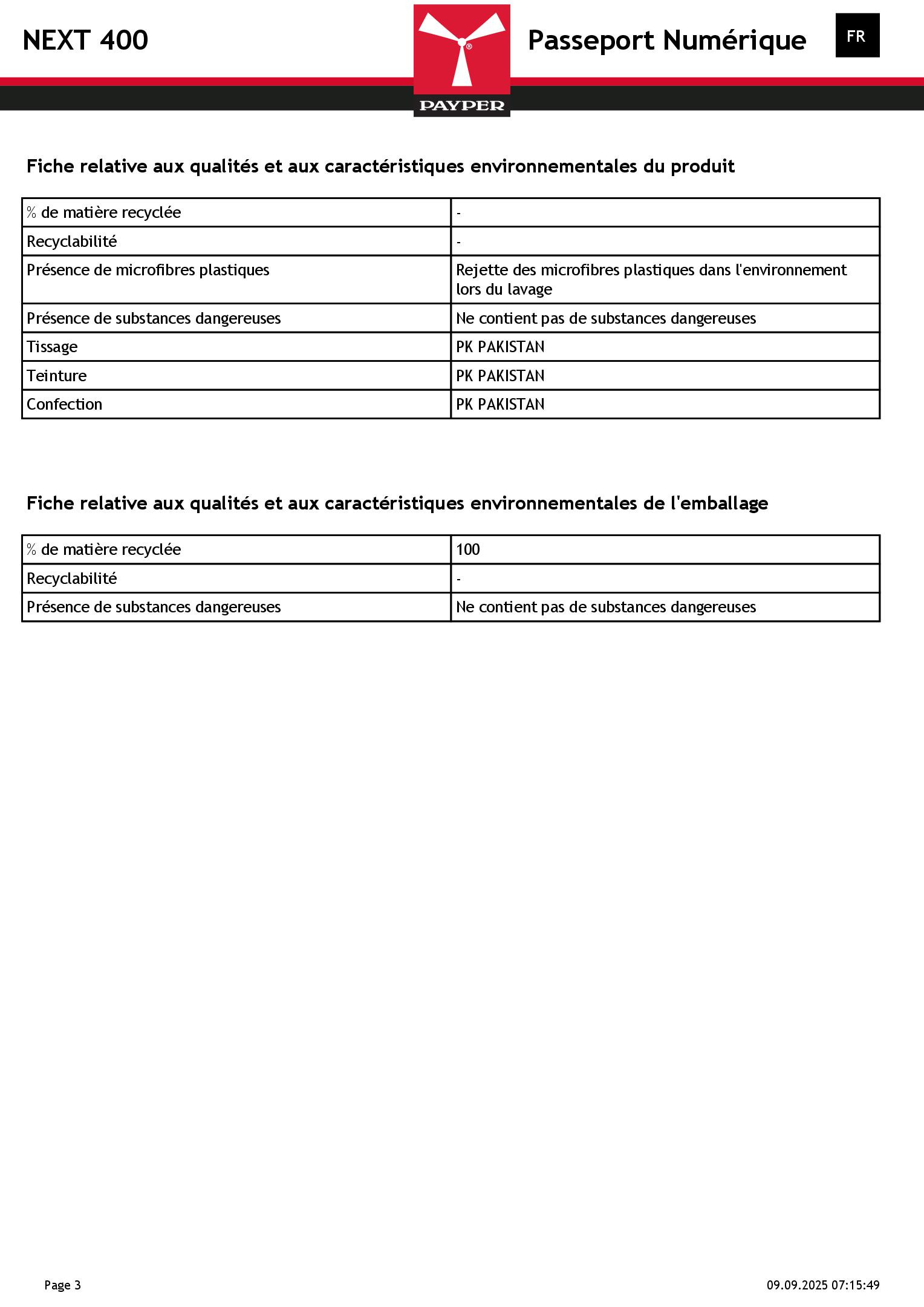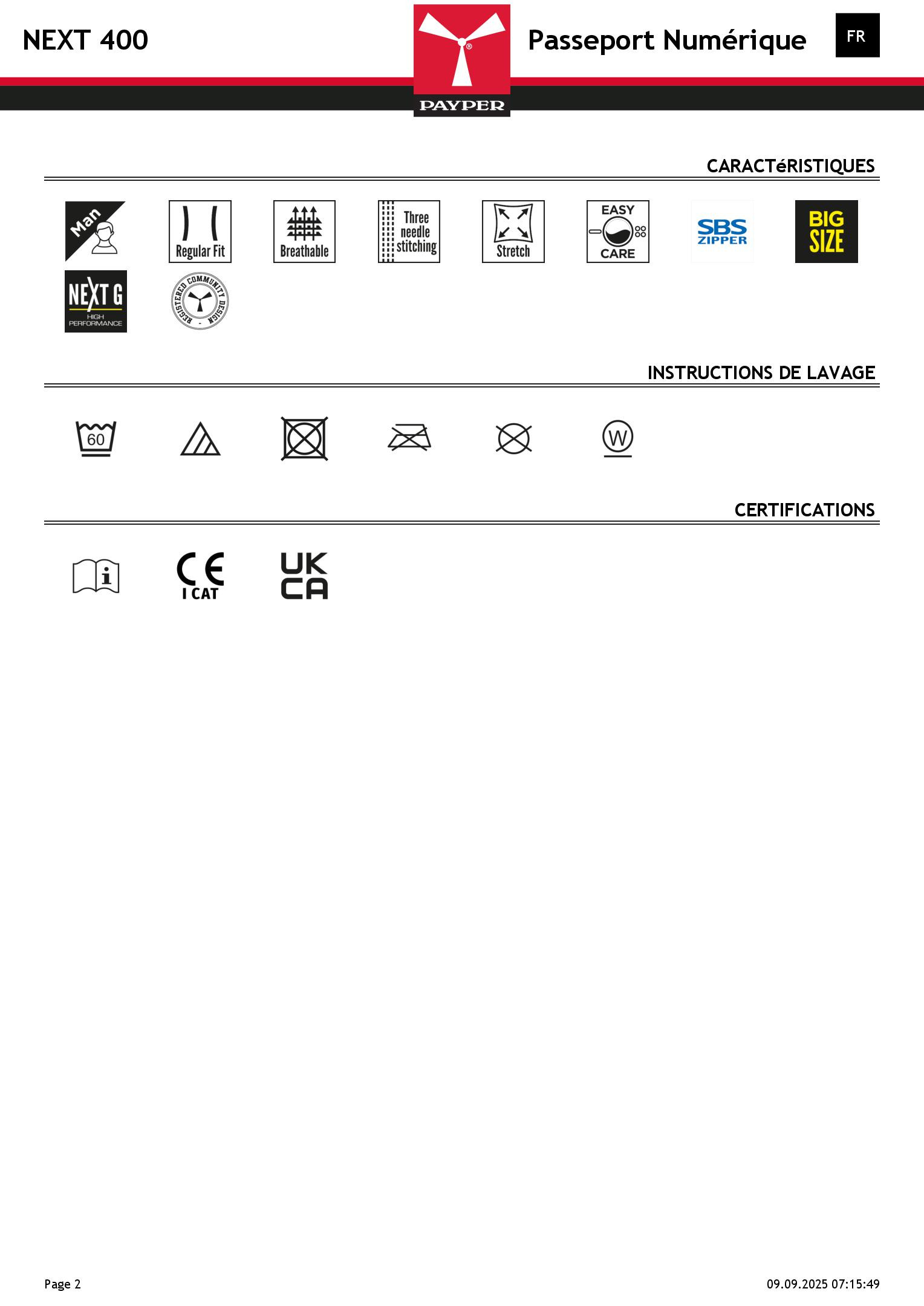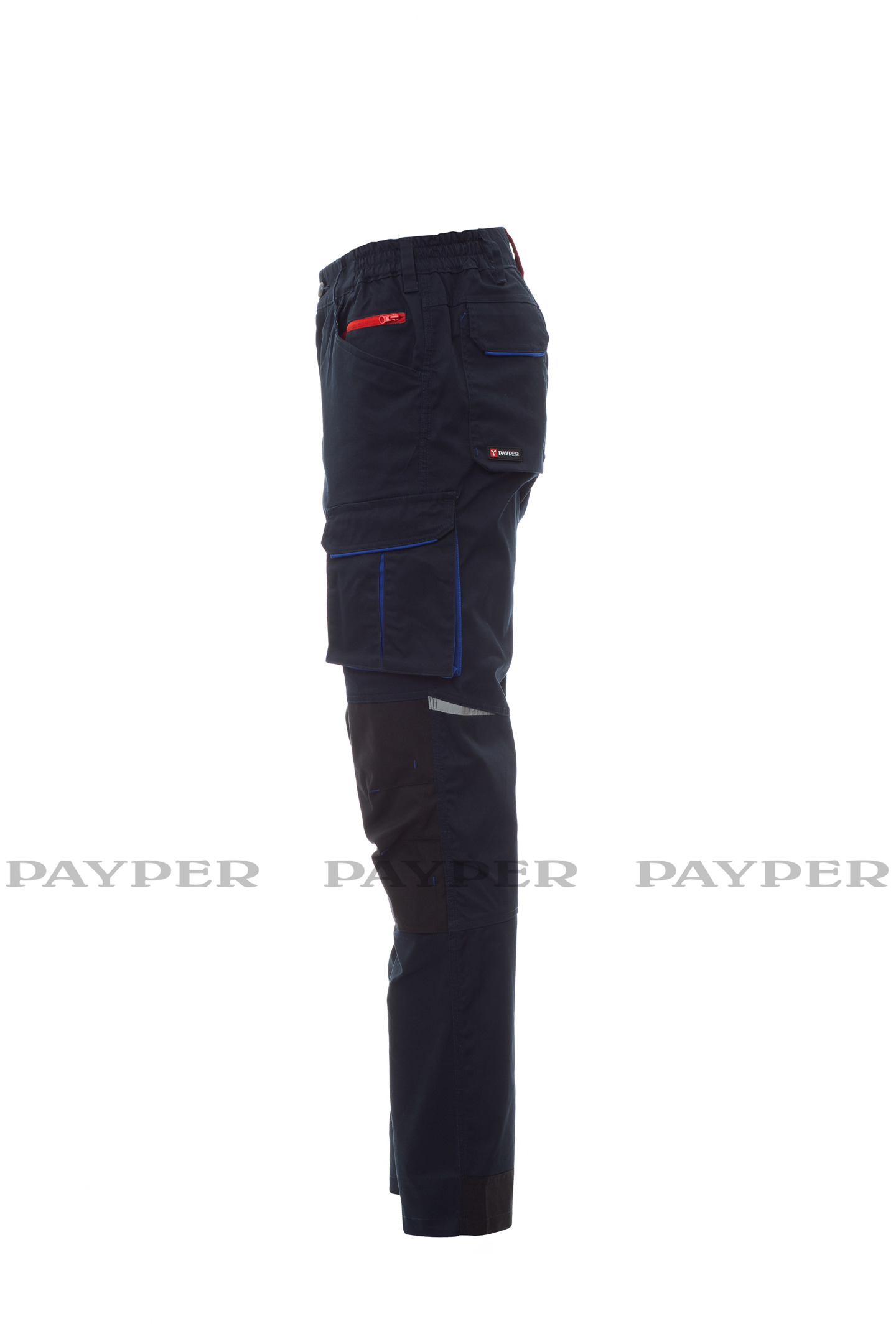 Pantalon unisexe, stretch, multi-saison, avec élastiques latéraux et passants à la taille, fermeture à zip et bouton personnalisé. Doté sur le devant de deux poches profilées, une petite poche porte-monnaie à droite, une petite poche de sécurité fermée par zip à gauche. L'avant de la jambe gauche comporte une poche à soufflet, avec rabat à fermeture autoagrippante et porte-badge. L'avant de la jambe droite comporte : une petite poche pour smartphone avec passepoil rétroréfléchissant et une poche à soufflet. Les deux jambes sont dotées de porte-genouillères, en nylon Oxford 500D, en tissu en contraste, avec ouverture par le bas et d'inserts rétroréfléchissants indiquant l'ouverture. L'arrière comporte : une poche avec rabat et fermeture autoagrippante, une poche porte-mètre (jambe droite) ; une poche ouverte avec deux bandes rétroréfléchissantes (jambe gauche) ; des inserts rétroréfléchissants au niveau des genoux et talonnette en tissu en contraste pour les deux jambes. Coutures à trois aiguilles sur l'entrejambe, l'intérieur et l'extérieur jambe. Baguettes de renfort en contraste à différents endroits. Les tailles (italiennes) centrales 48-50-52 ont un intérieur jambe habituel de 82 cm.