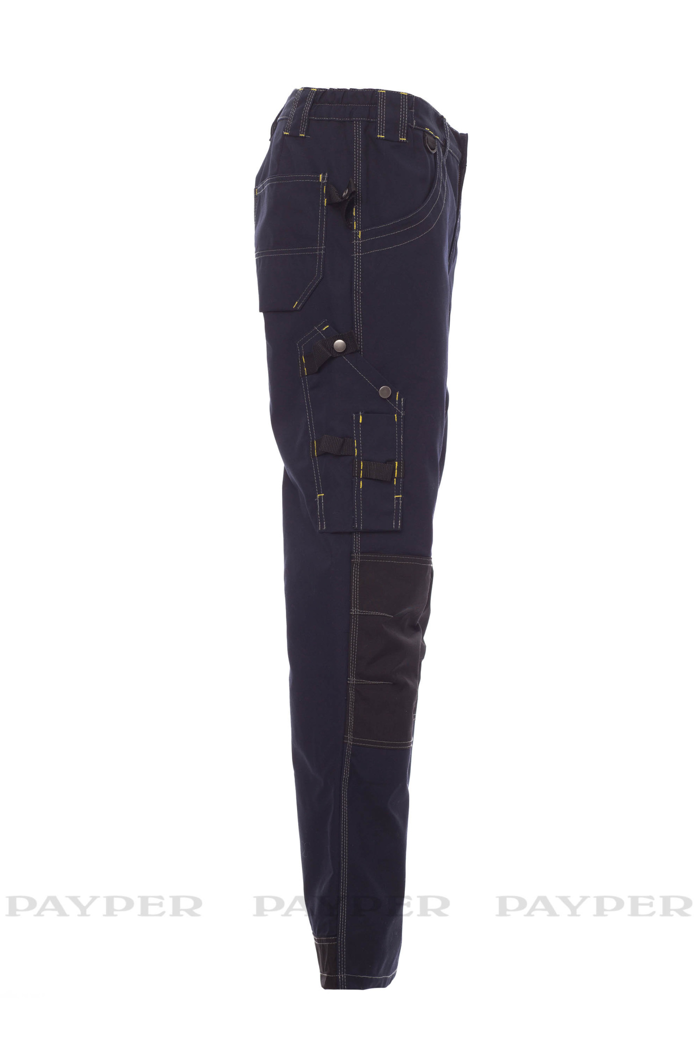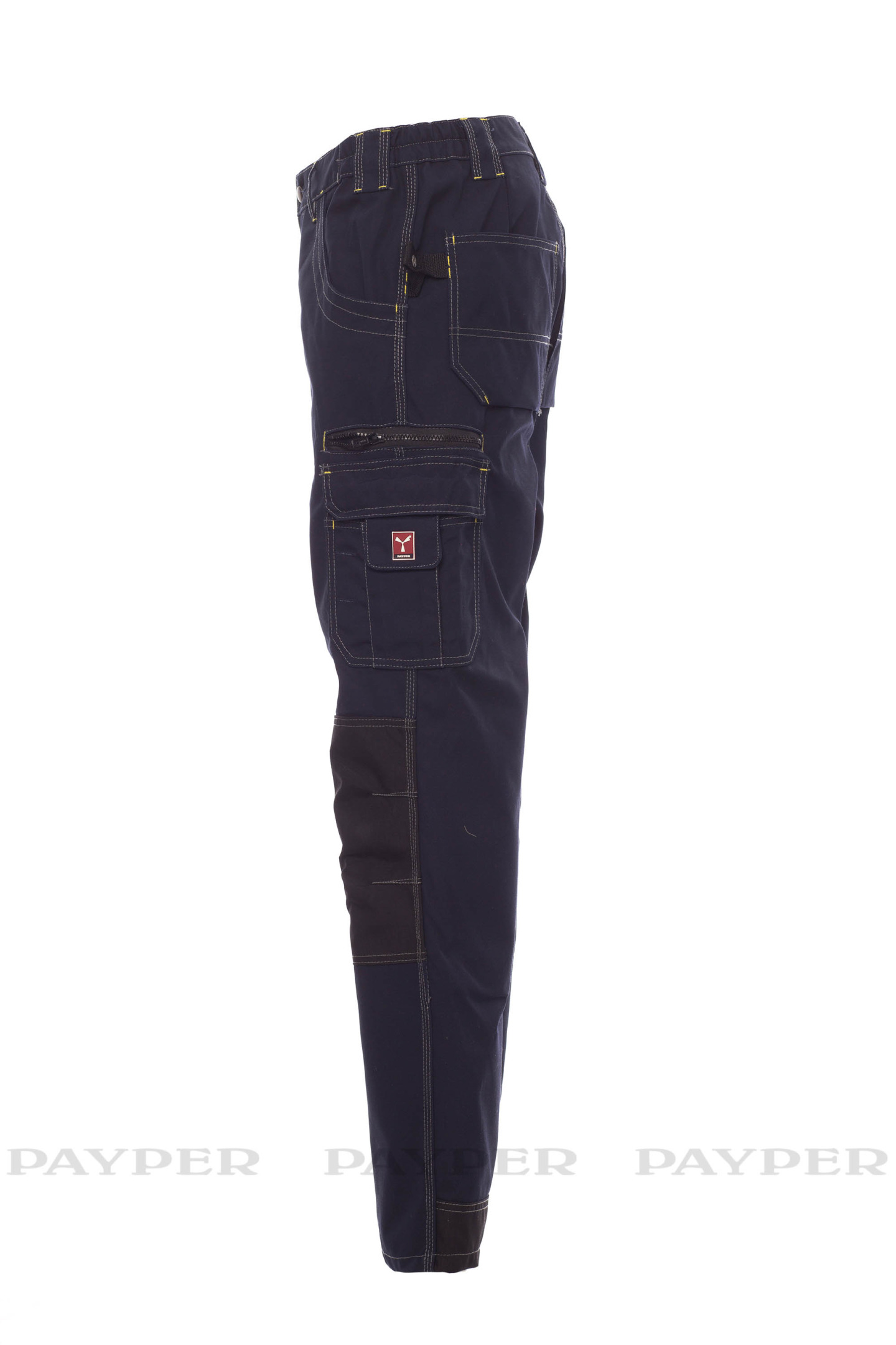 Pantalon homme multi-saison, avec porte-genouillères en Cordura, élastiques latéraux et passants à la taille, fermeture par zip et bouton en métal. Deux poches avant avec intérieur dans le même matériau que le pantalon ; deux poches latérales multifonction avec porte-badge détachable et refermable ; une poche avec zip ; deux poches arrière ouvertes et une poche porte-marteau. Inserts et surpiqûres en contraste, triples coutures.