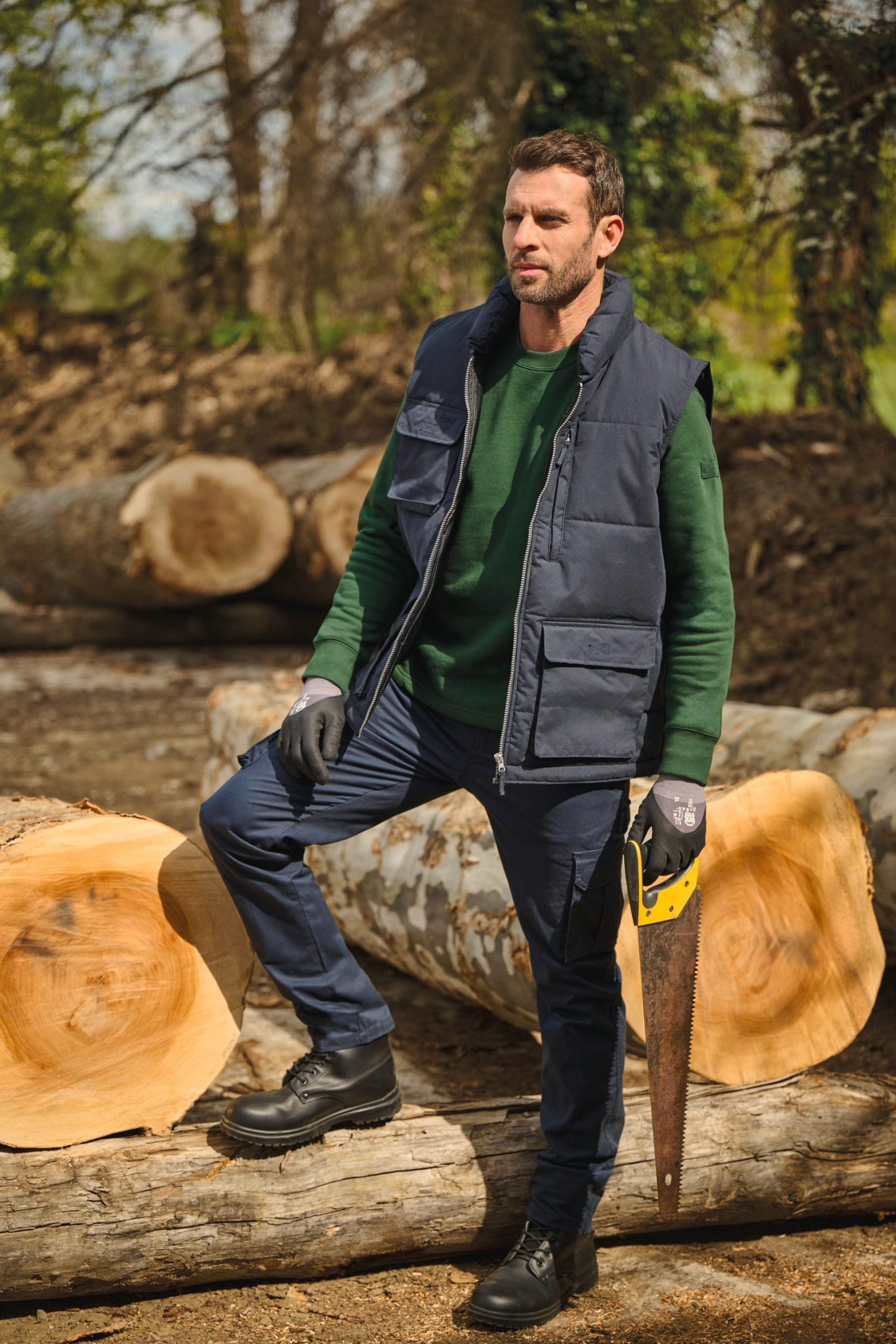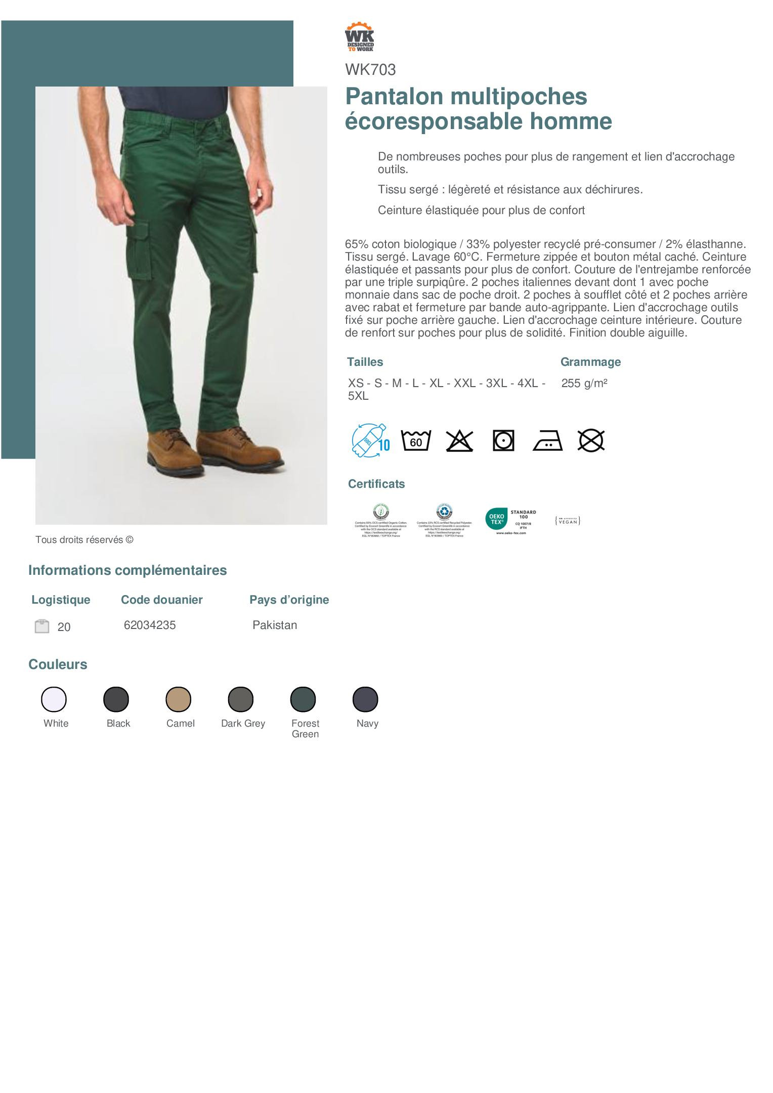 65% coton biologique / 33% polyester recyclé pré-consumer / 2% élasthanne. Tissu sergé. Lavage 60°C. Fermeture zippée et bouton métal caché. Ceinture élastiquée et passants pour plus de confort. Couture de l’entrejambe renforcée par une triple surpiqûre. 2 poches italiennes devant dont 1 avec poche monnaie dans sac de poche droit. 2 poches à soufflet côté et 2 poches arrière avec rabat et fermeture par bande auto-agrippante. Lien d'accrochage outils fixé sur poche arrière gauche. Lien d'accrochage ceinture intérieure. Couture de renfort sur poches pour plus de solidité. Finition double aiguille.