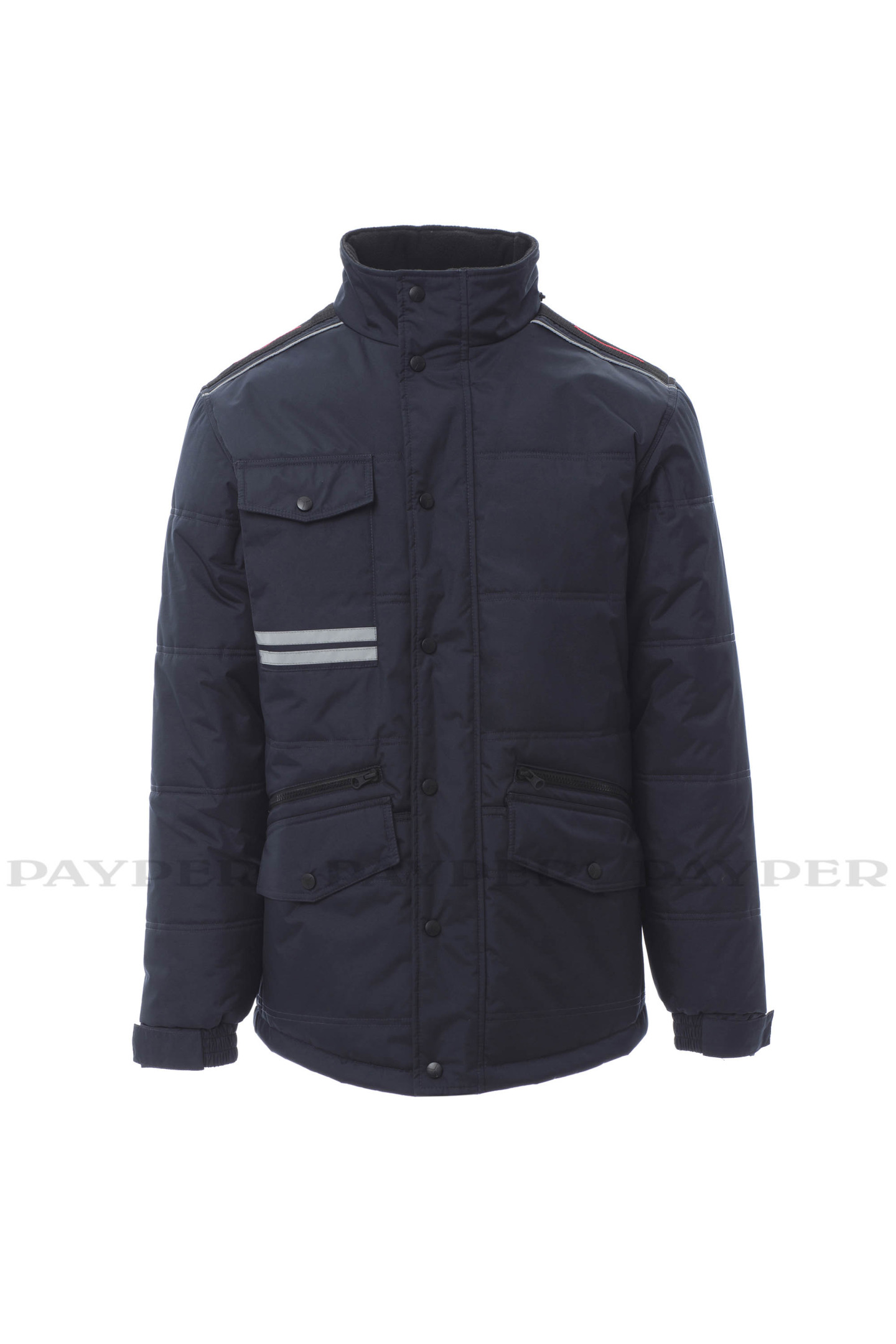 Blouson homme 3/4, zip en plastique de 8 mm avec curseur en métal, à rabat et boutons en plastique, dos profilé et capuche repliable dans le col, deux poches extérieures LOCK SYSTEM et deux poches zippées, poches obliques pour faciliter l’introduction des mains, une poche poitrine pour smartphone et anneau porte-badge, bandes réfléchissantes sur la poche et le dos. Intérieur : rembourré, polaire en contraste sur le dos et le col, une poche, zip intérieur pour faciliter les impressions et les broderies.