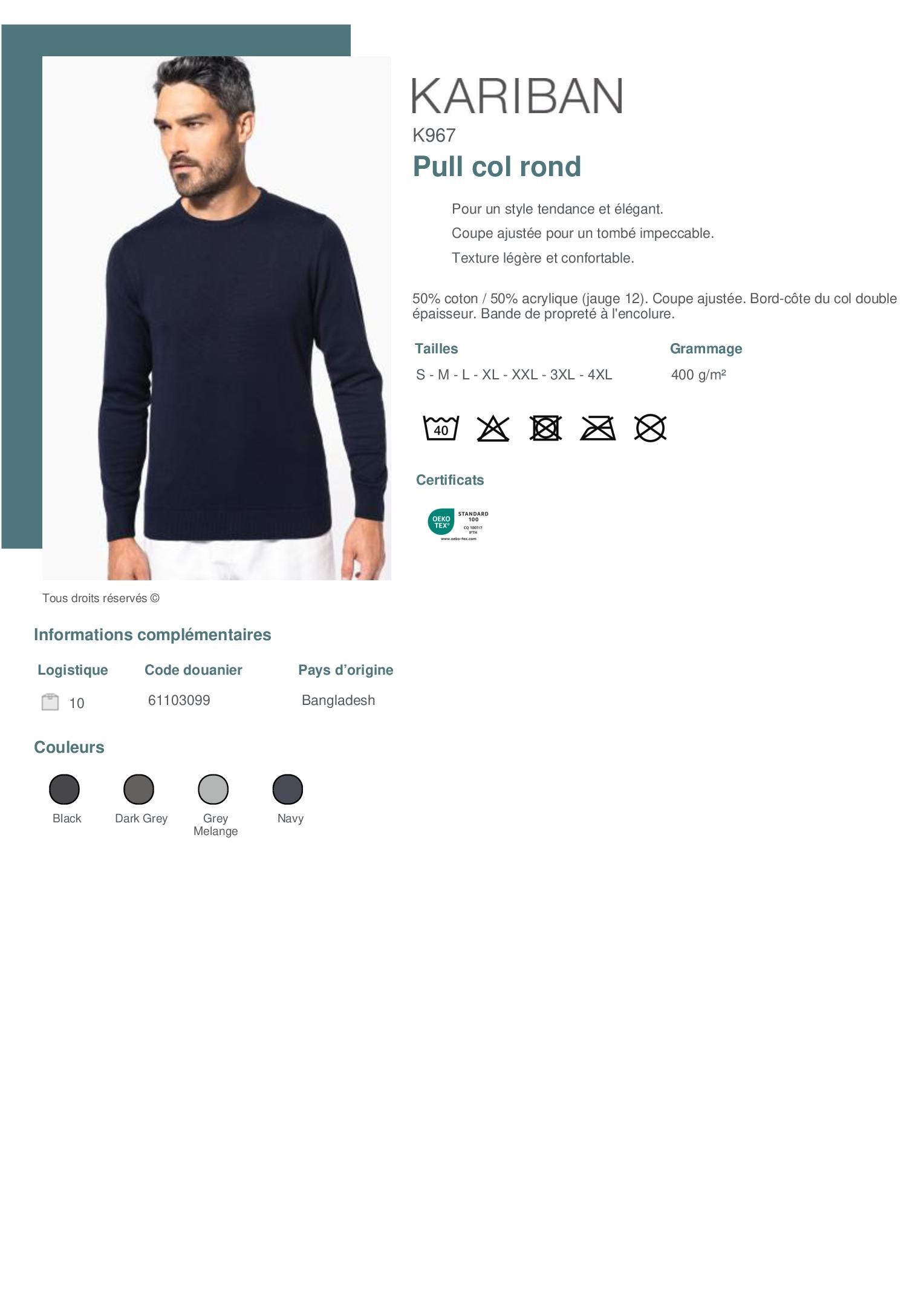 50% coton / 50% acrylique (jauge 12). Coupe ajustée. Bord-côte du col double épaisseur. Bande de propreté à l'encolure.