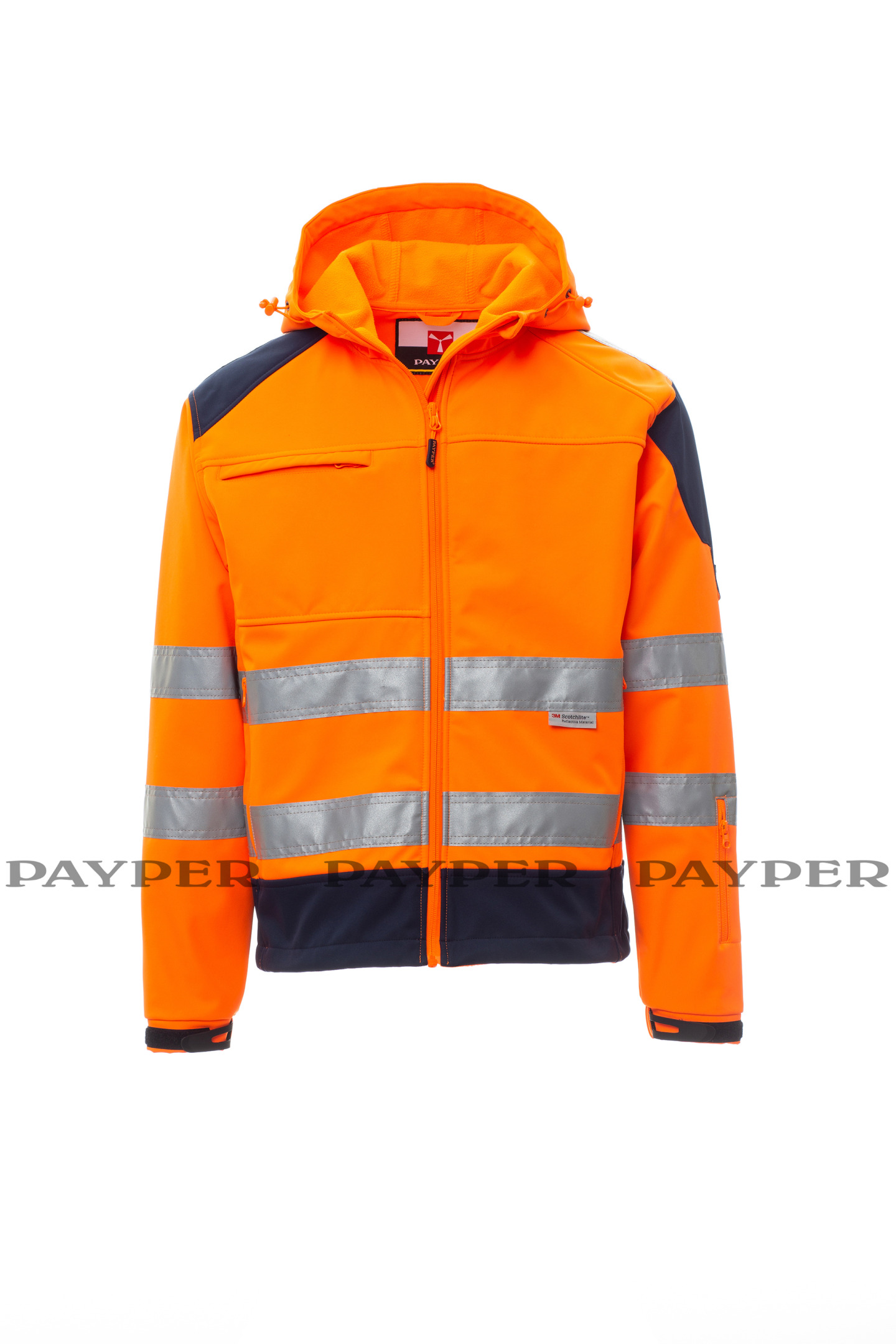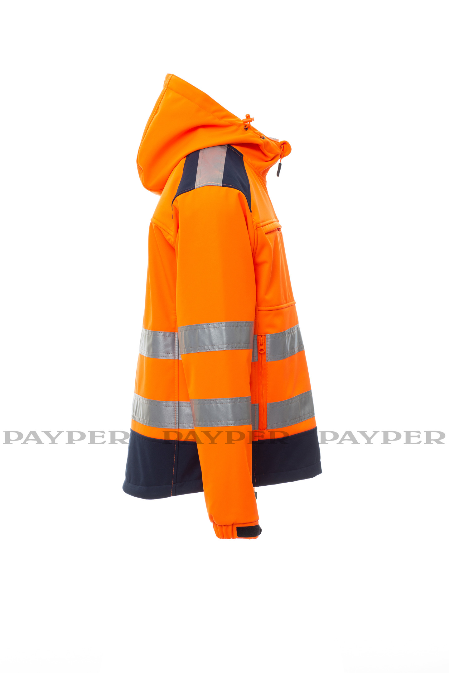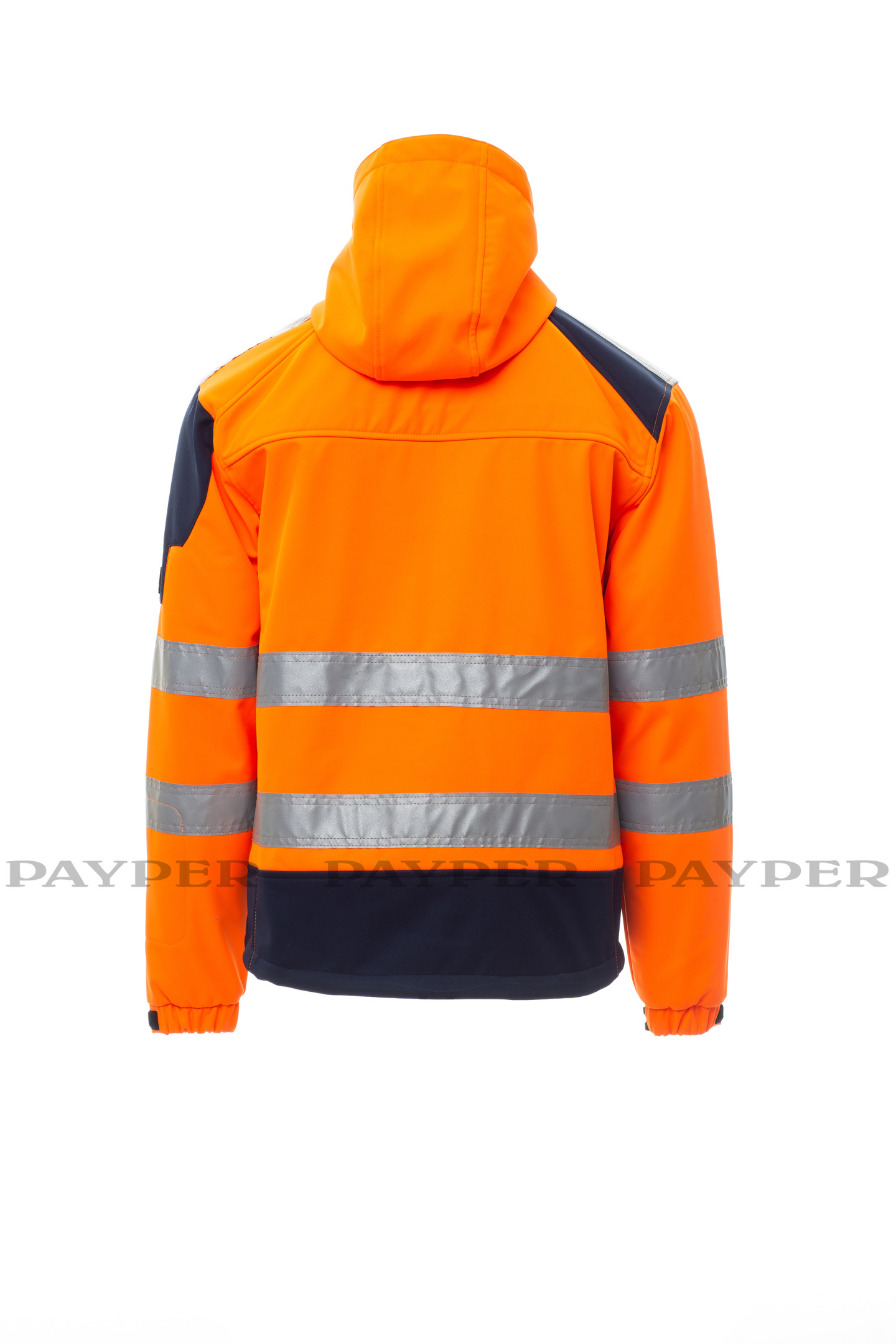 WP 8000 mm H₂O, WVT 5000 g/m² 24h. Veste ergonomique pour homme bicolore à haute visibilité avec bandes 3M, manches raglan, capuche profilée avec deux coutures et coulisse, zip long SBS, poignets réglables par serre-poignet en velcro, deux poches latérales avec zip, une poche poitrine, porte-badge détachable et refermable et une poche sur le bras gauche.