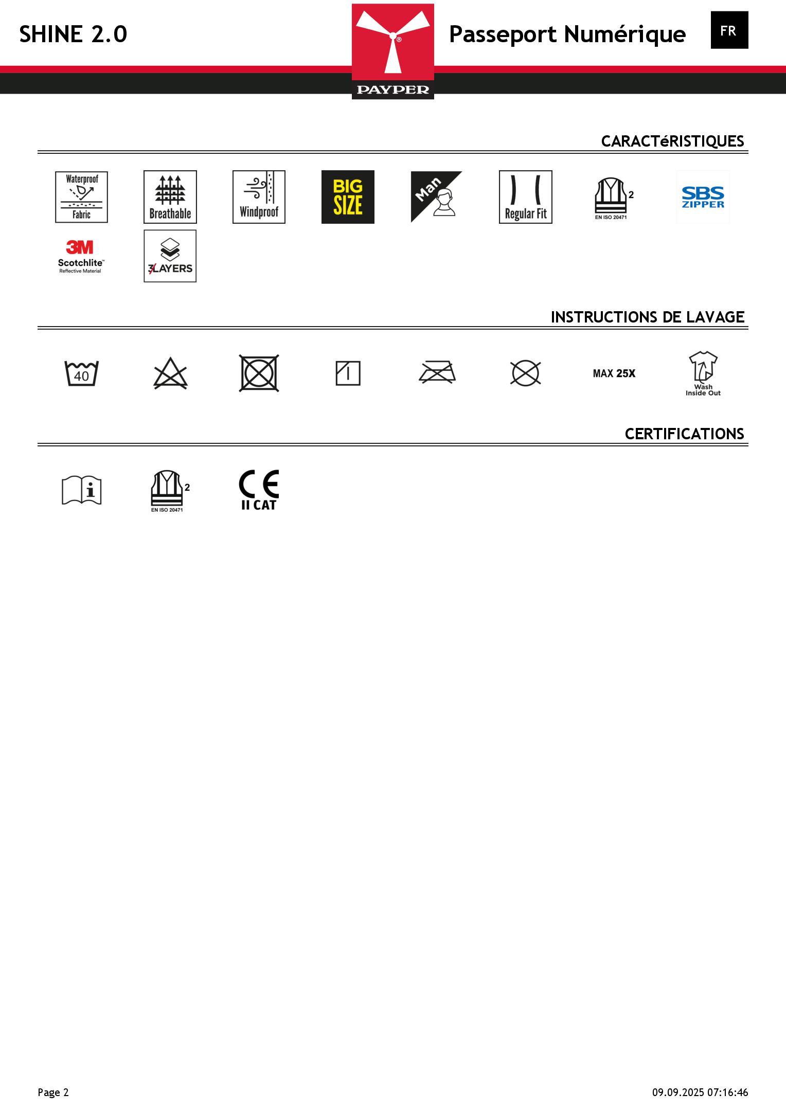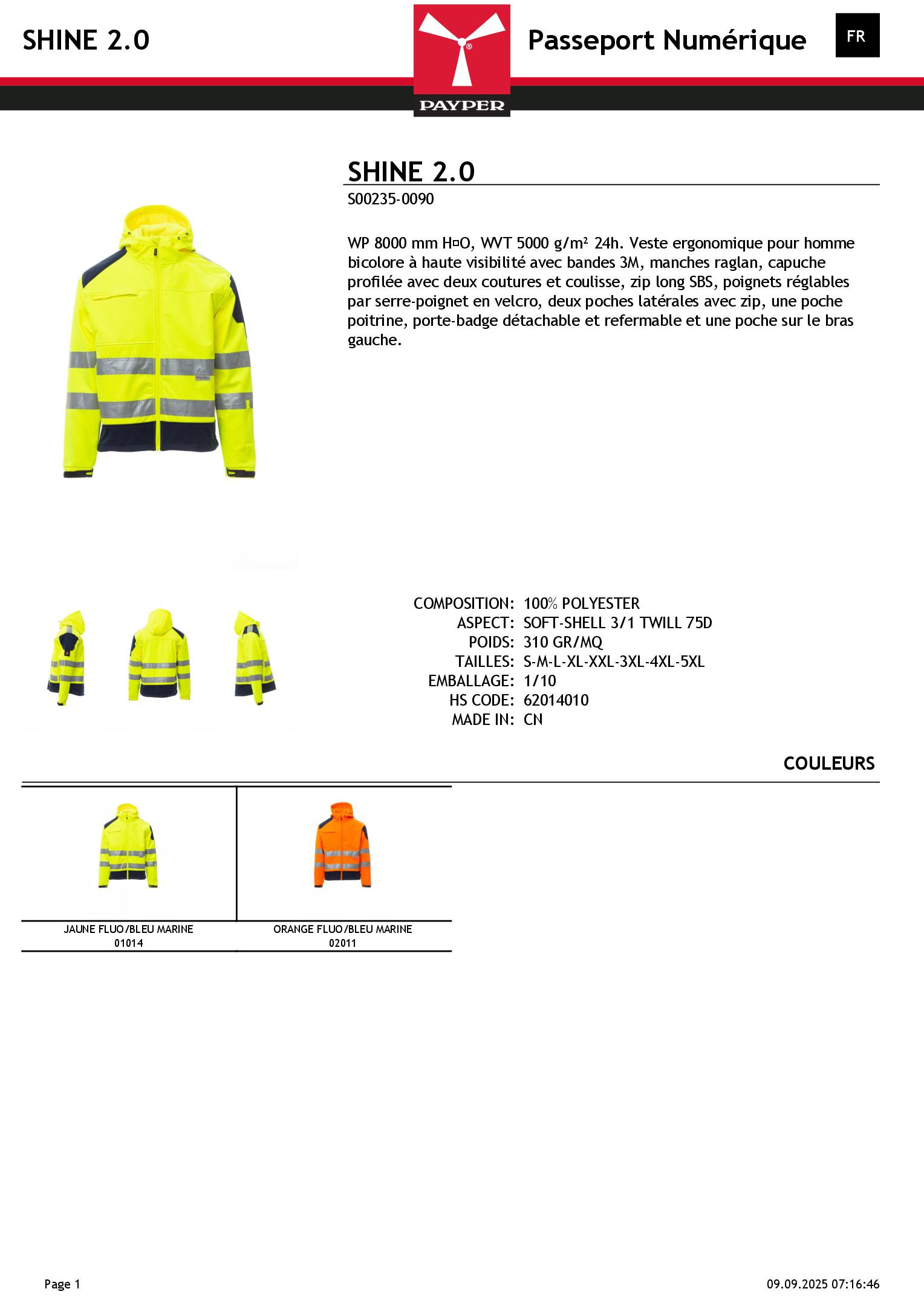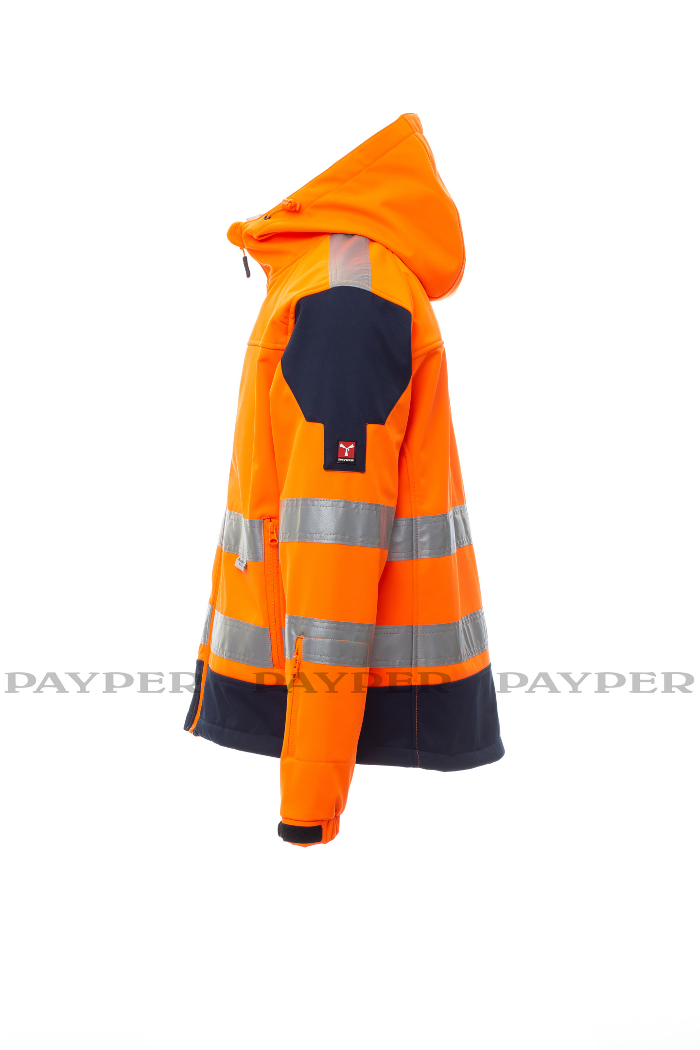 WP 8000 mm H₂O, WVT 5000 g/m² 24h. Veste ergonomique pour homme bicolore à haute visibilité avec bandes 3M, manches raglan, capuche profilée avec deux coutures et coulisse, zip long SBS, poignets réglables par serre-poignet en velcro, deux poches latérales avec zip, une poche poitrine, porte-badge détachable et refermable et une poche sur le bras gauche.